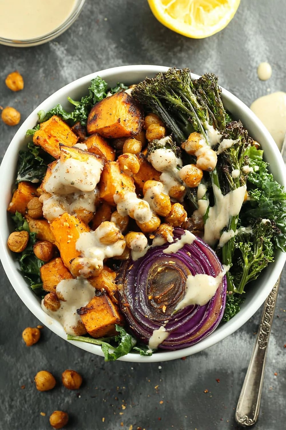 The combination of caramelized sweet potatoes, perfectly spiced chickpeas, and vibrant greens creates a symphony of textures that’ll make your taste buds do a happy dance.