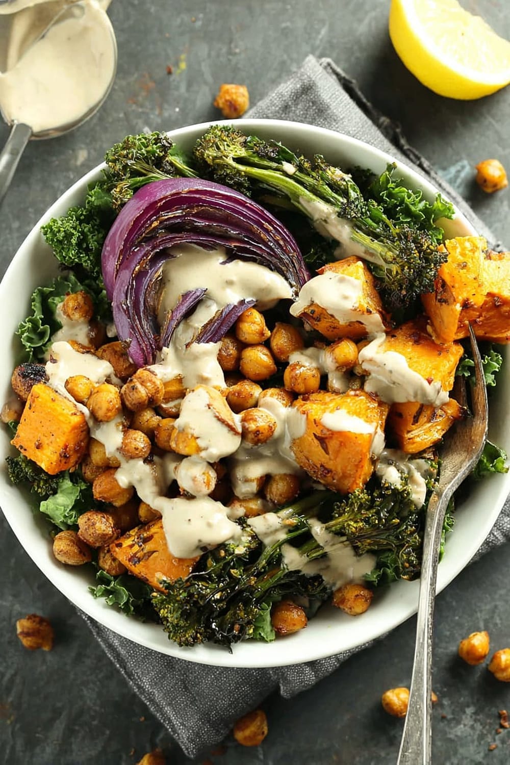 Warm pita bread or naan makes this bowl feel more substantial and helps scoop up every drop of that tahini sauce. Pickled vegetables like quick-pickled red onions or cucumbers add bright acidity that cuts through the richness. Hummus with fresh vegetables creates a Mediterranean mezze-style meal, while roasted nuts like almonds or pistachios add satisfying crunch and healthy fats.