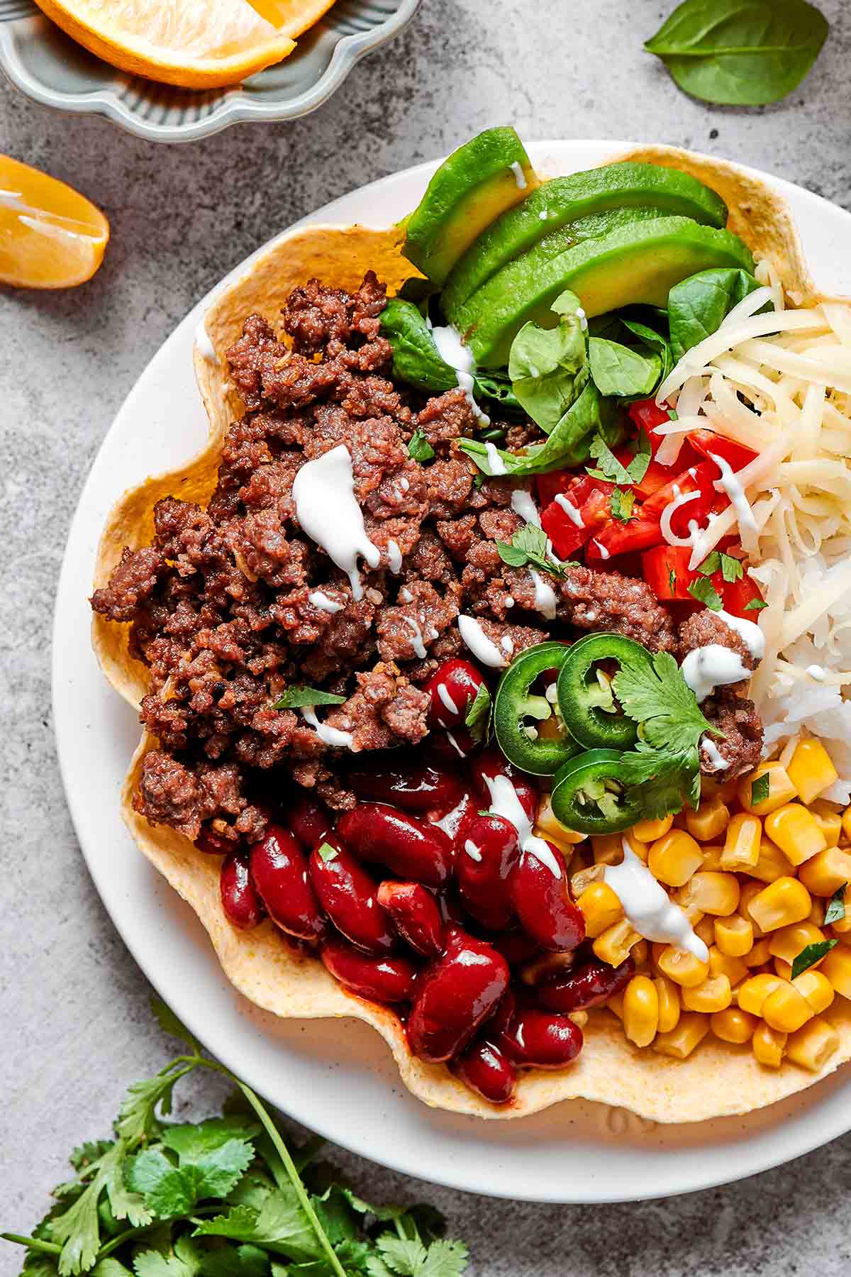 For a low-carb version, skip the tortilla bowl and serve everything over shredded lettuce. Or try using large lettuce leaves as wraps.