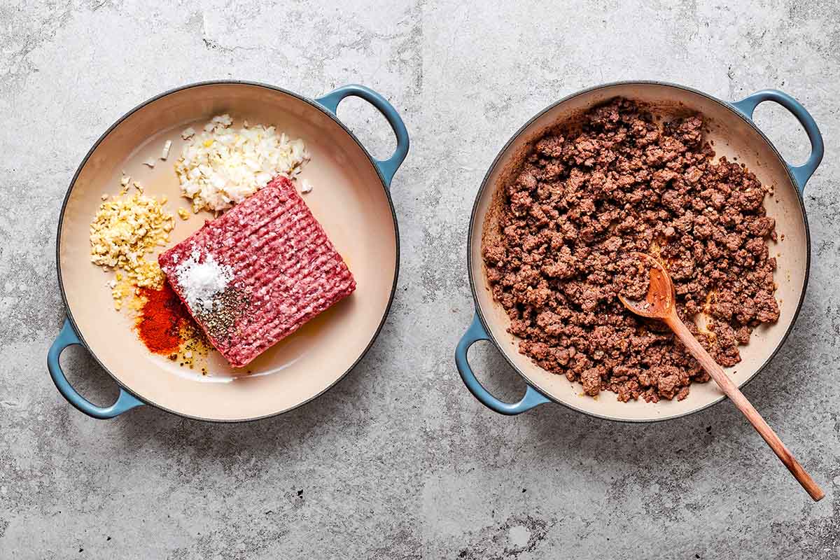 Start by cooking the ground beef in a large skillet over medium-high heat. Break it apart as it cooks. Add onions and garlic when the beef starts to brown.