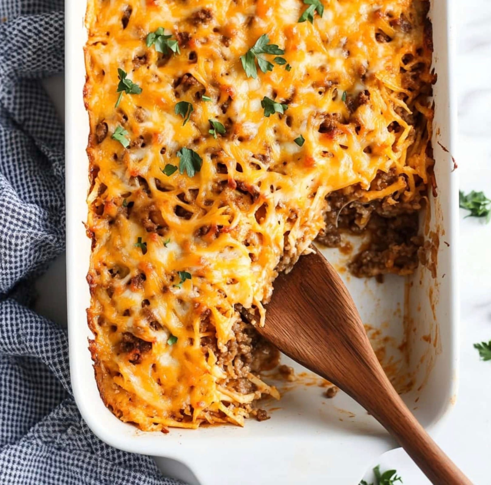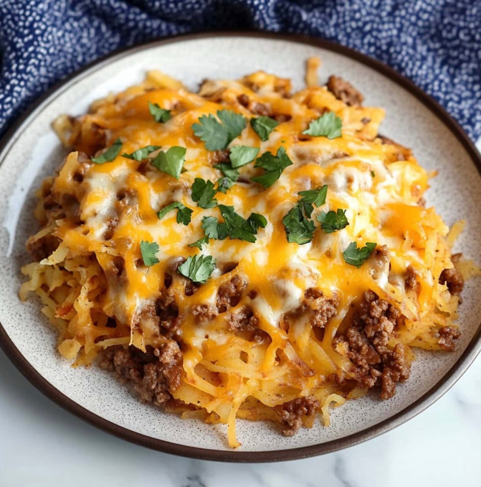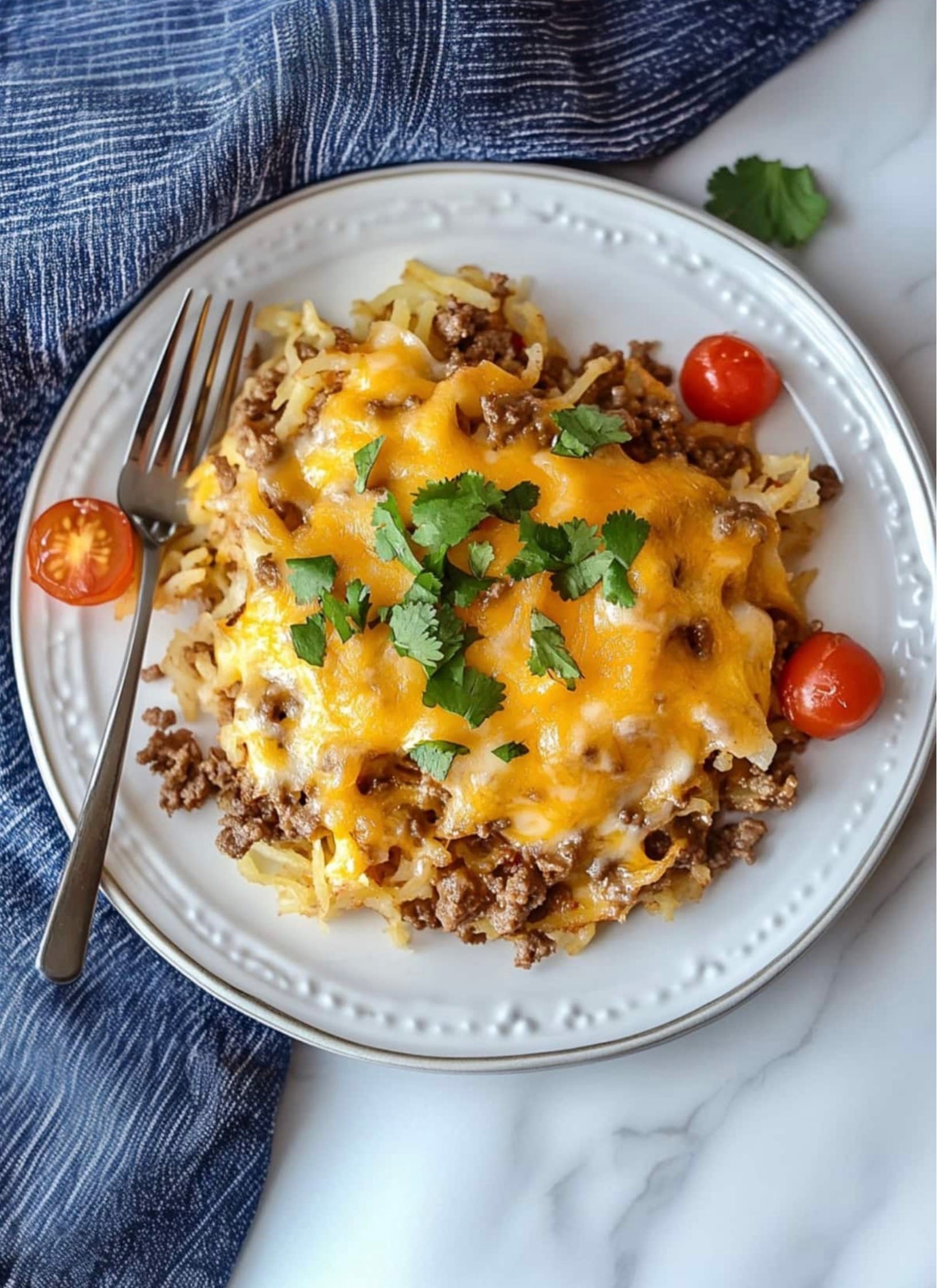 The mix of ground beef, taco spices, and crispy hashbrowns creates a yummy blend of textures and flavors. It’s topped with melted cheese for extra goodness. You can add your favorite taco toppings like sour cream or salsa to make it even better.