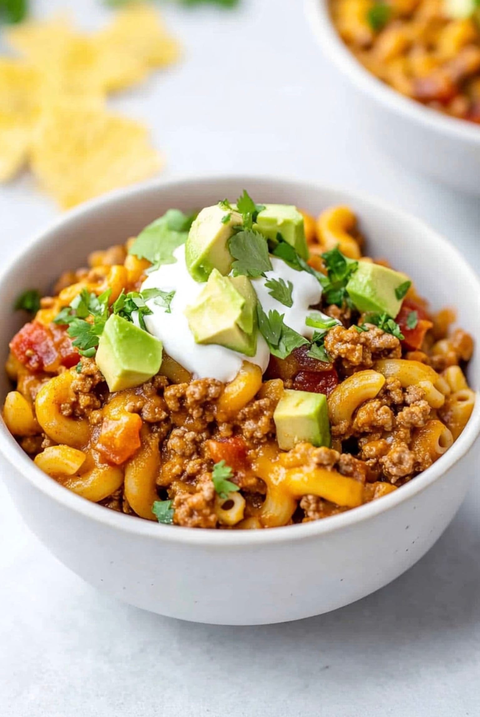 Finish your taco mac and cheese with your favorite toppings like green onions, avocado, or crushed tortilla chips. Enjoy your tasty meal!