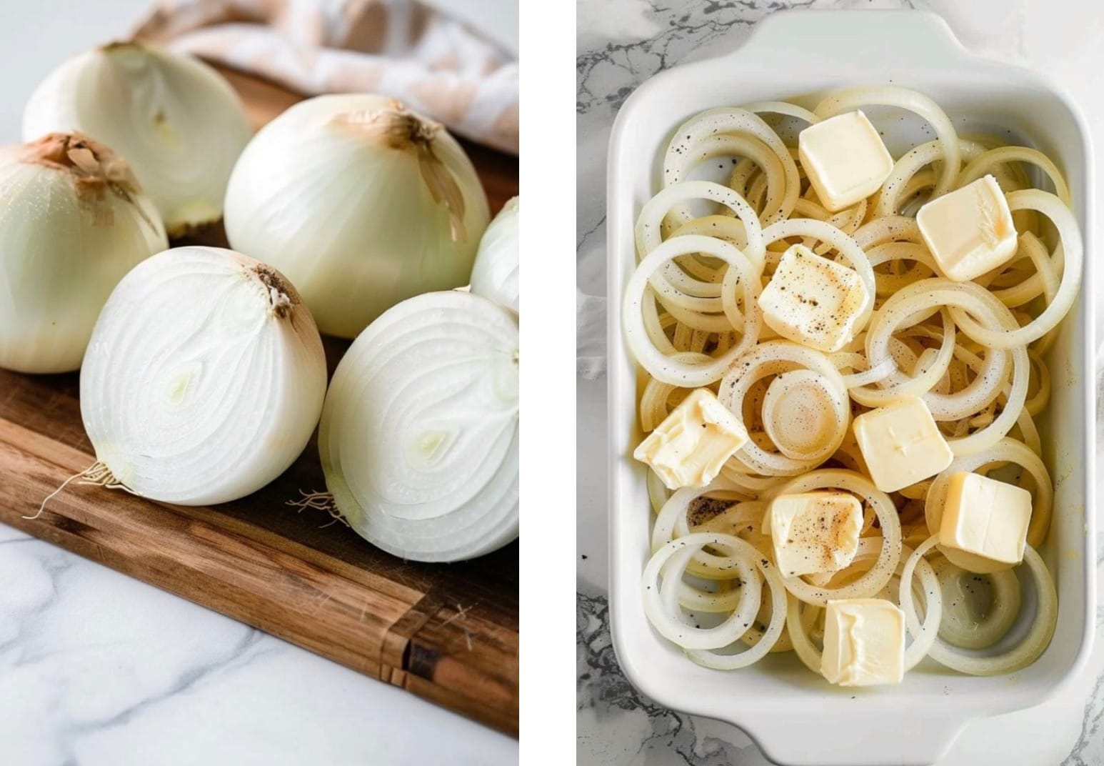 Arrange the seasoned onions in your prepared baking dish. Cut the butter into thin slices or small cubes and spread them evenly over the onions.