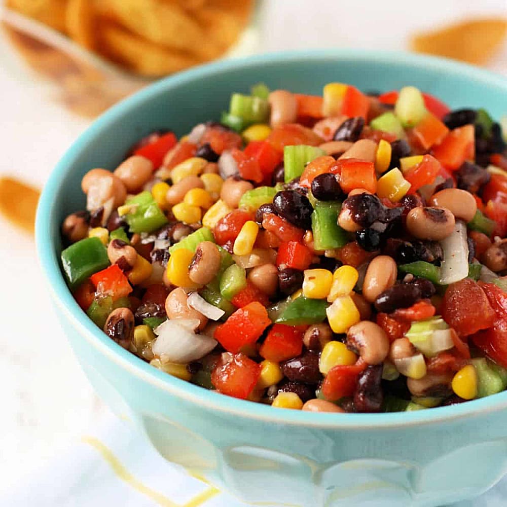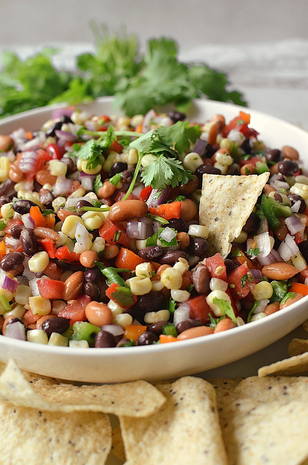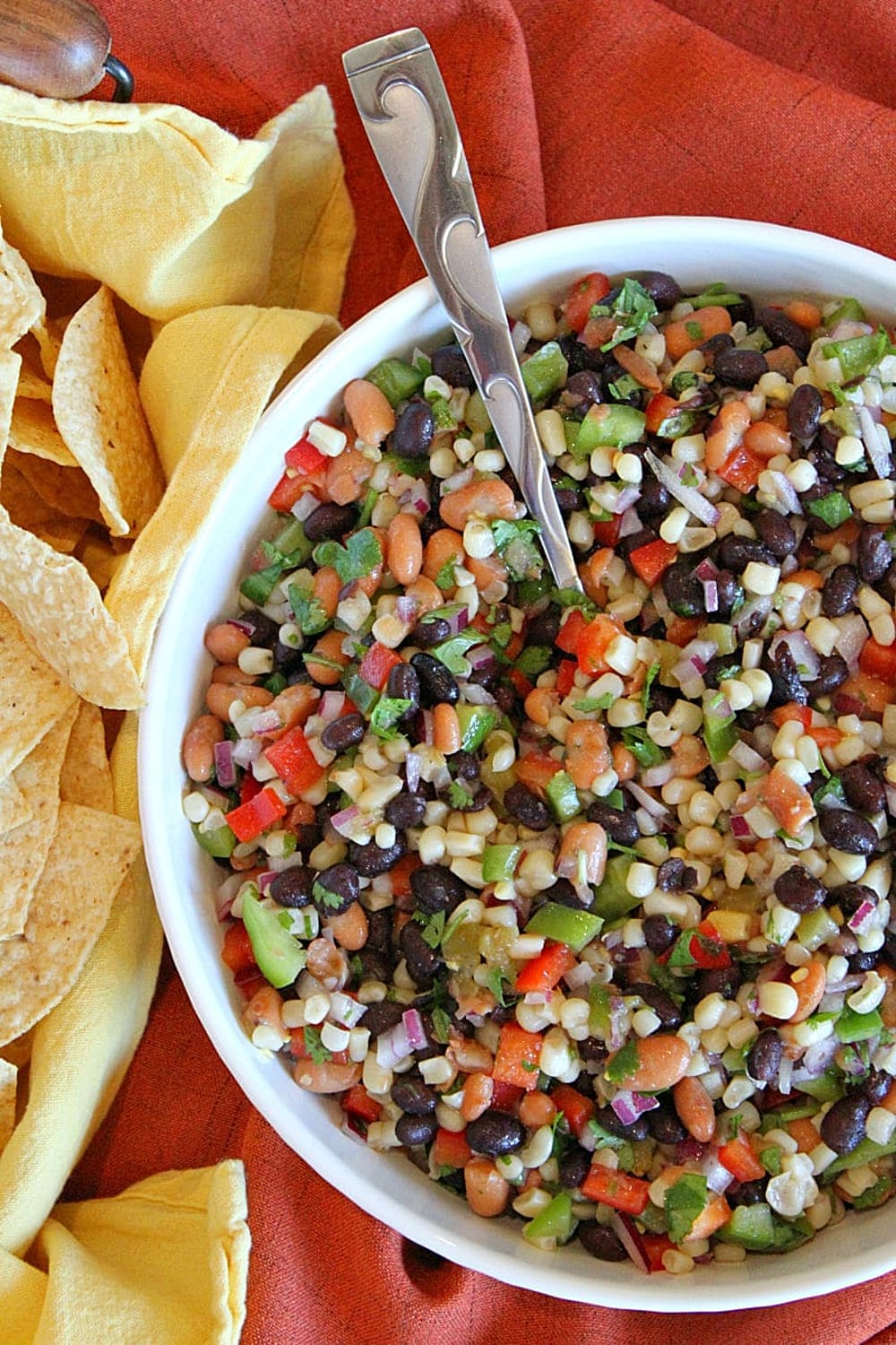 - Pour the dressing over the vegetable mixture and toss very well using tongs or a large spoon. Make sure to get all the way to the bottom of the bowl – those beans and corn love to hide from the dressing. Toss for 1-2 minutes until you can see the dressing coating everything evenly and the colors look bright and glossy.