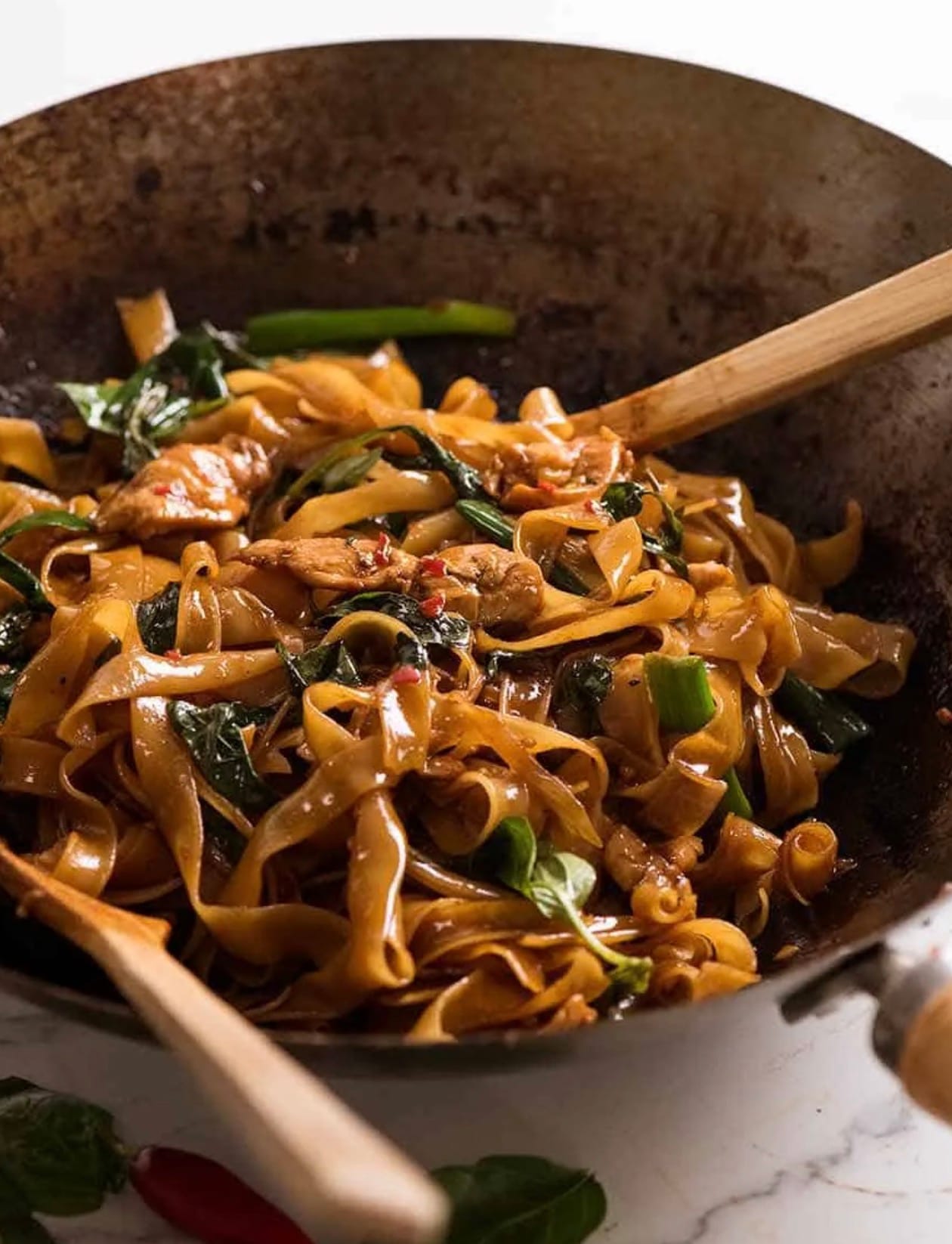 Take the wok off the heat. Add basil and give it a quick toss until it wilts. Serve your drunken noodles right away while they’re hot and fresh!