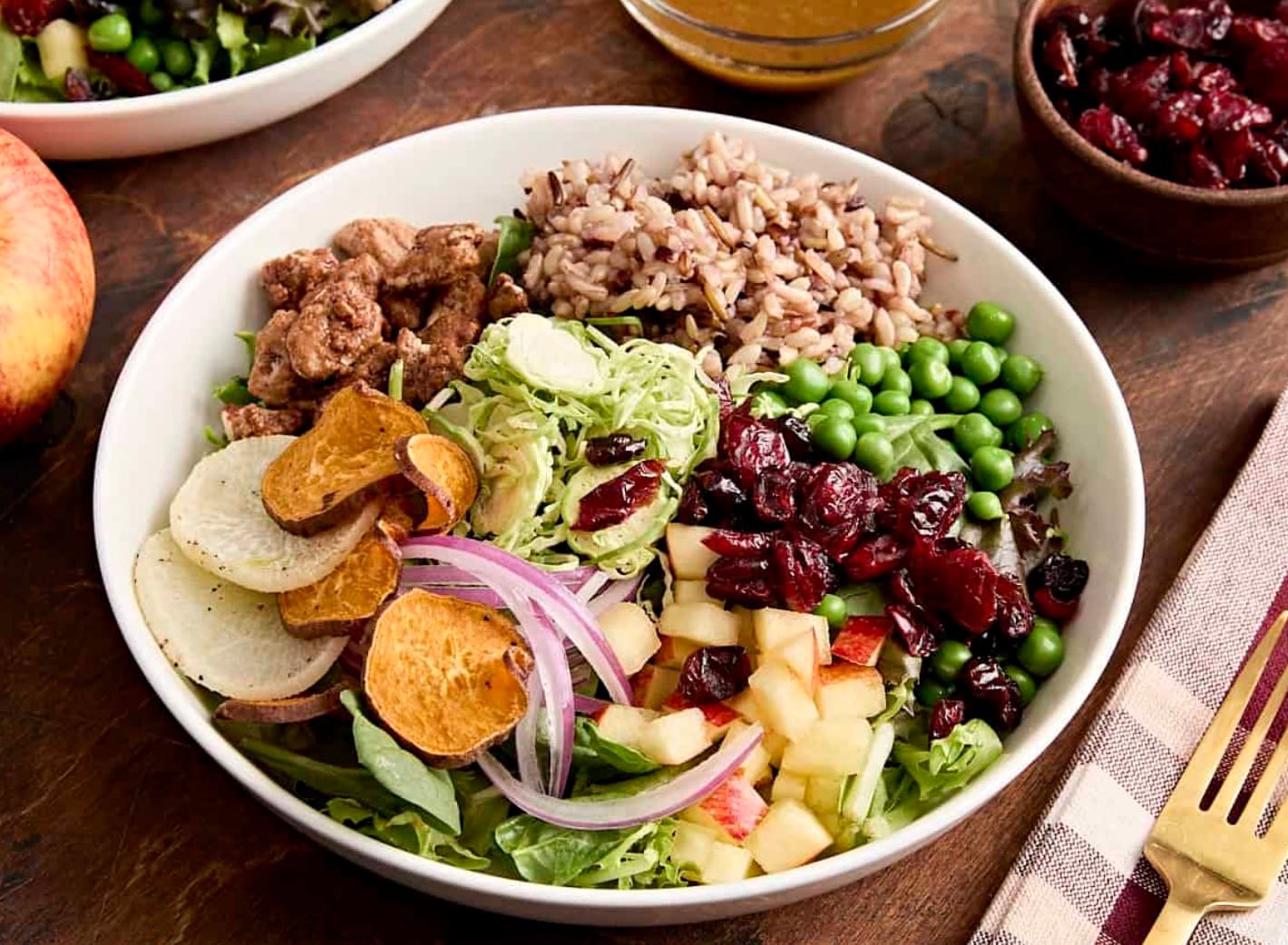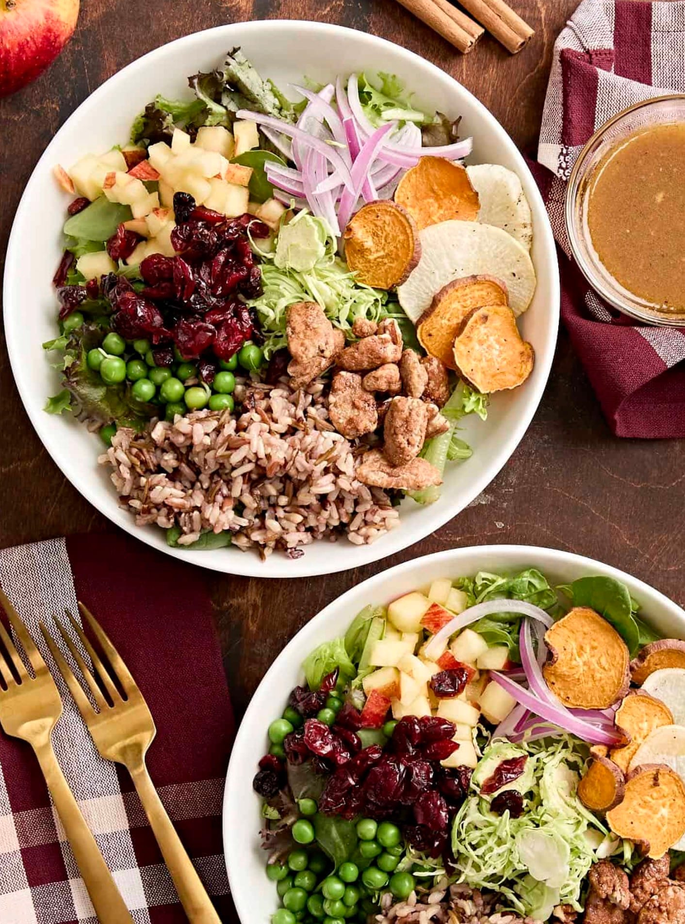 Thanksgiving Bowls are a tasty way to use up holiday leftovers. You can make these yummy salads in just over an hour. The bowls mix wild rice, roasted veggies, dried fruits, and nuts with a maple cinnamon dressing for a perfect blend of flavors and textures.