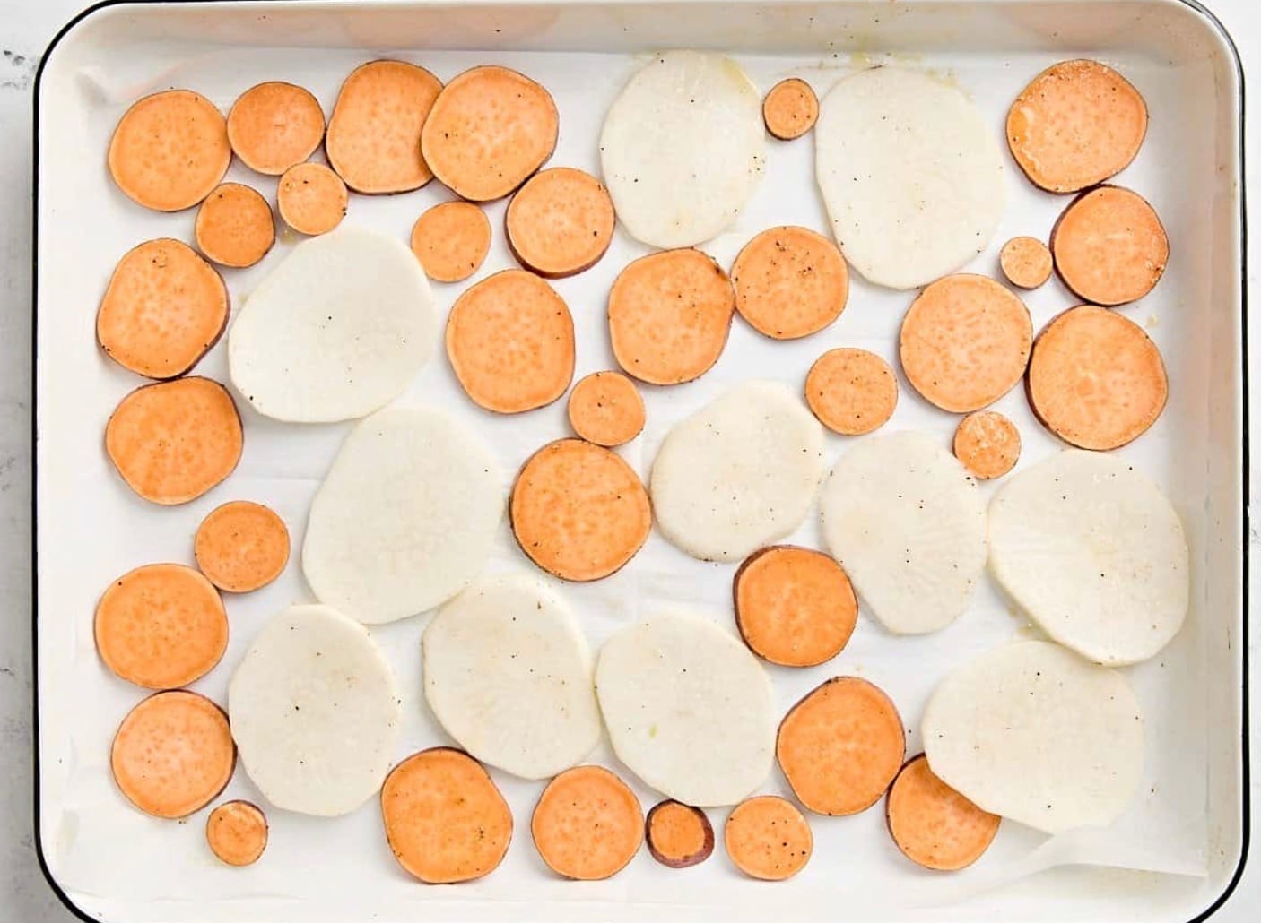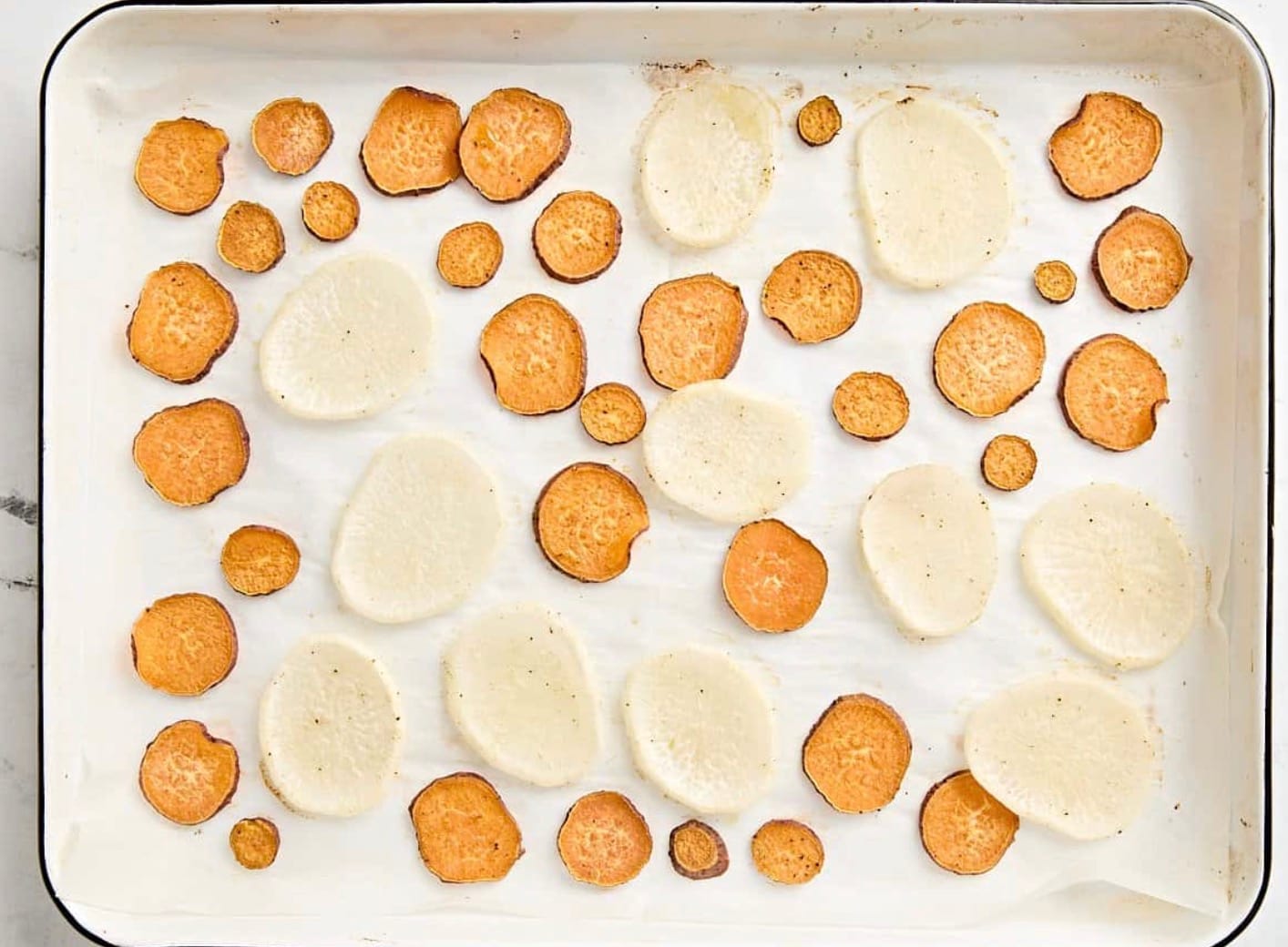 Toss the potato and turnip slices with olive oil, salt, and pepper. Spread them on a lined baking sheet and roast for 20 minutes until tender.