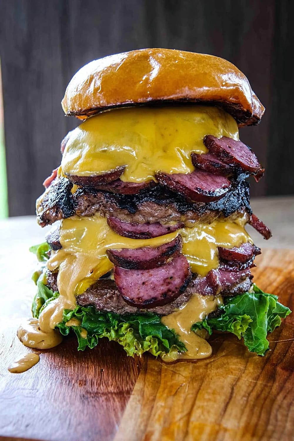 Picture this: thick slabs of house-smoked bologna layered with perfectly grilled beef patties, all drowning in melted cheese and stacked so high you’ll need an engineering degree just to figure out how to take a bite.