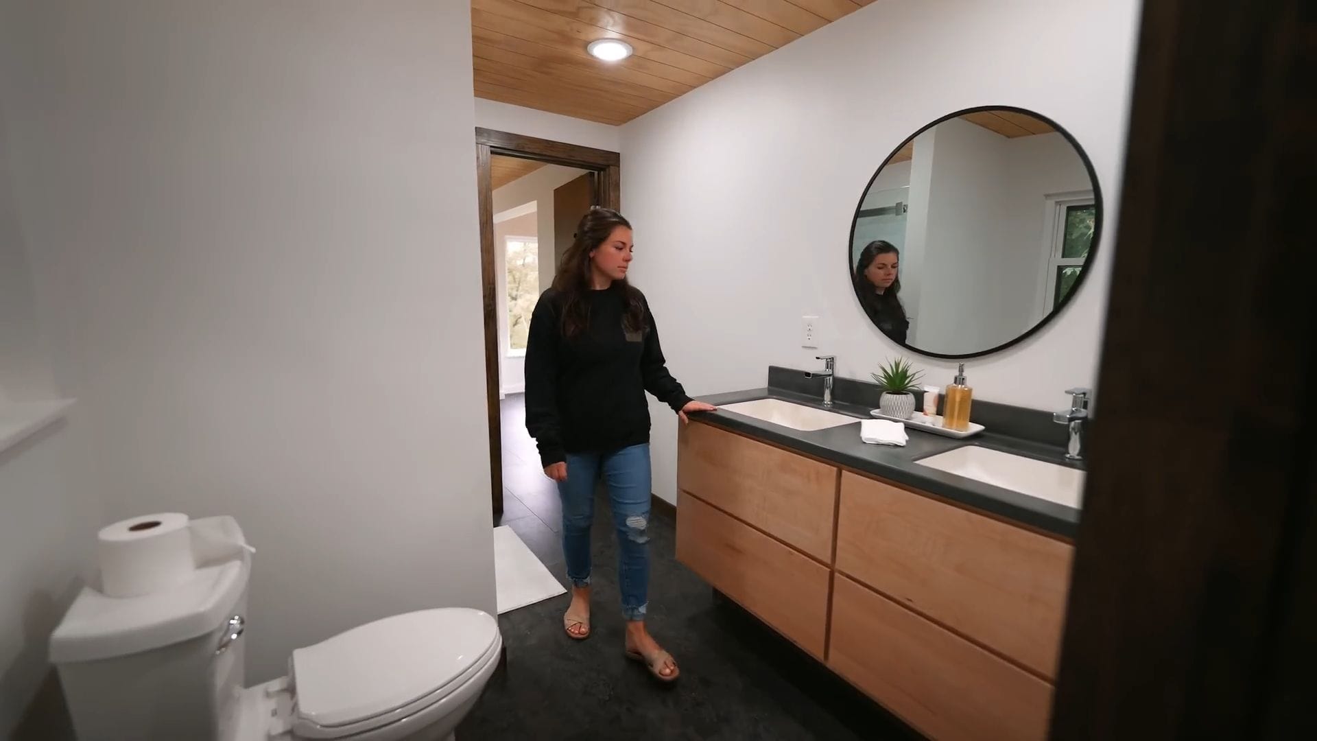 Additional windows ensure this bathroom remains bright and airy, while a compact vanity and toilet complete the space with everything positioned perfectly for both function and flow.