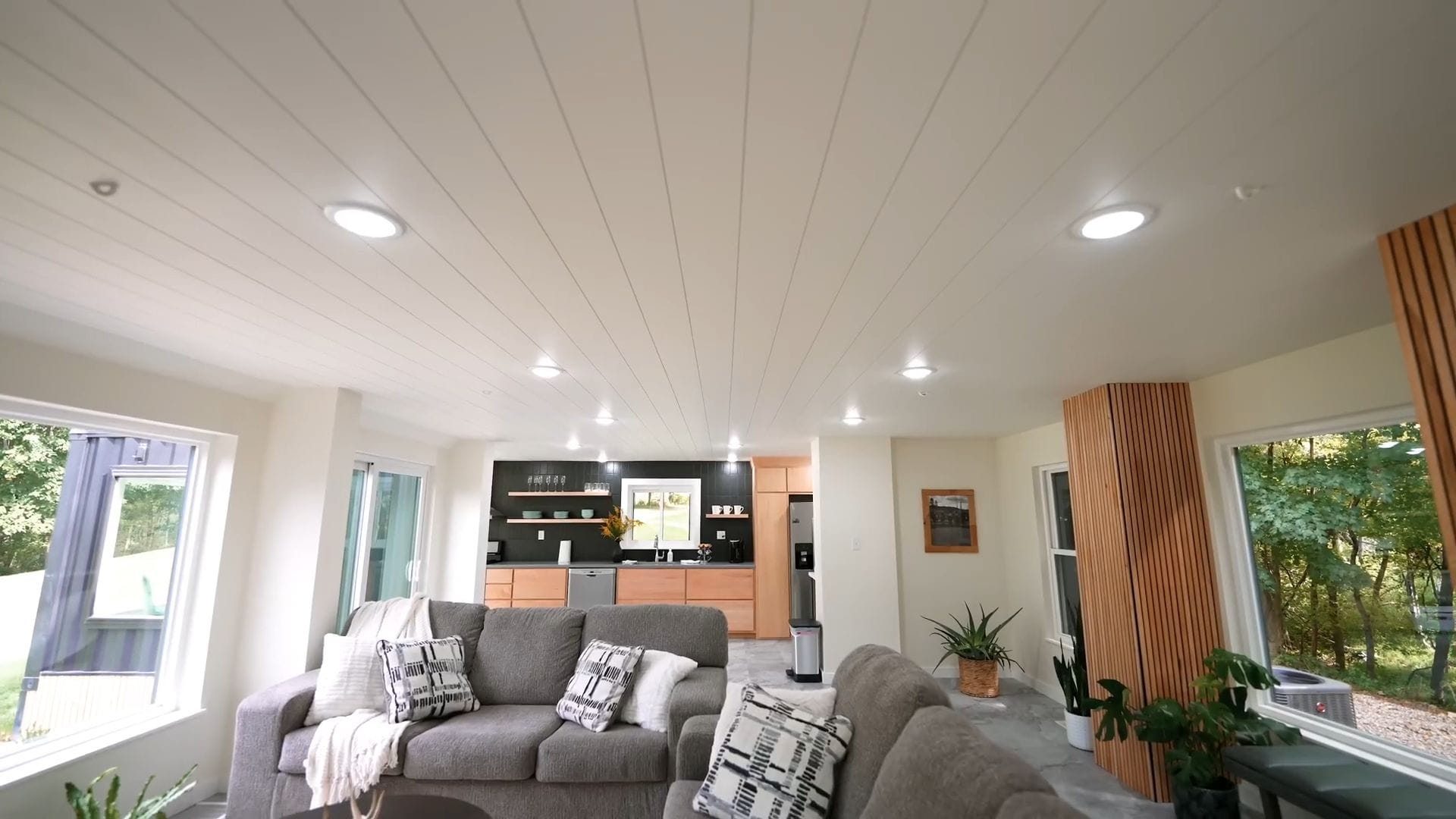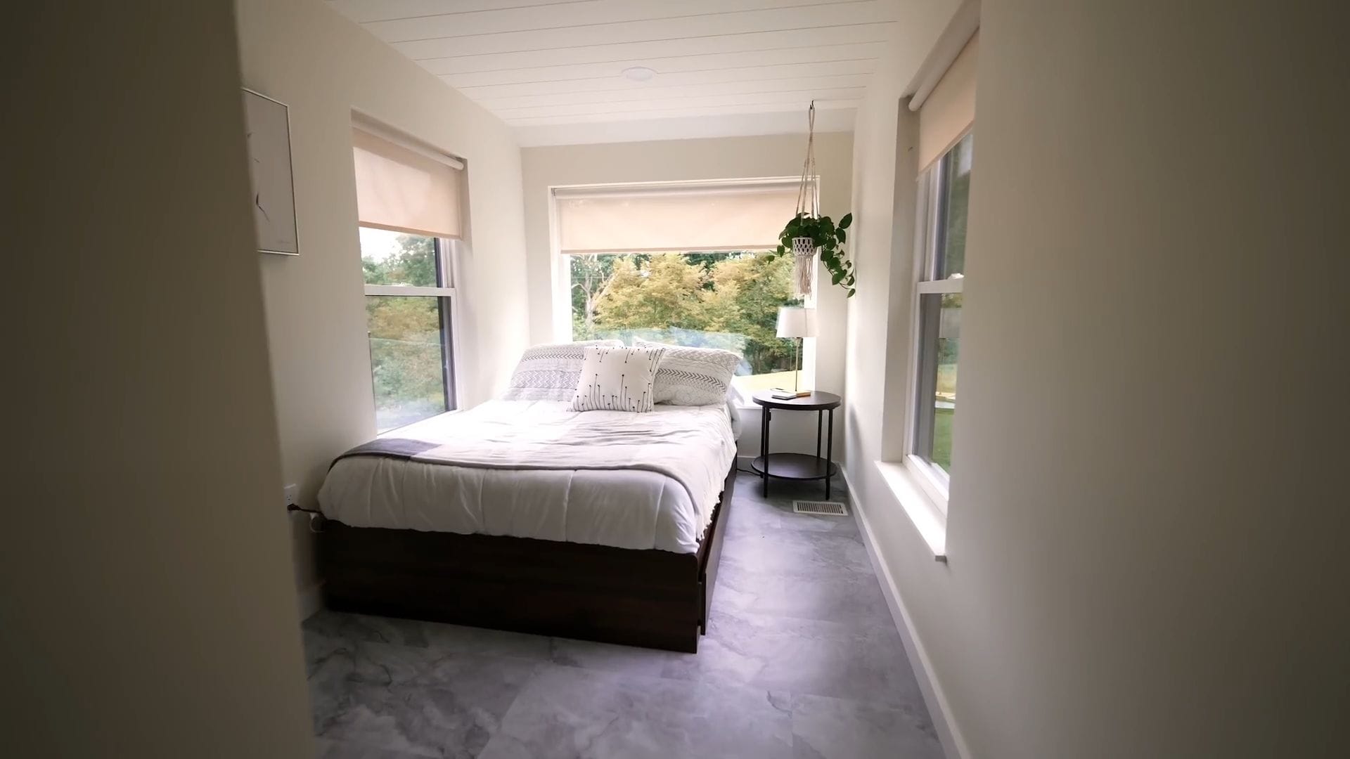 The white shiplap ceiling treatment flows seamlessly throughout the entire home, unifying all the spaces while maintaining that clean, contemporary aesthetic. From the living area, we can access the first bedroom through a nearby door that reveals another stunning space.