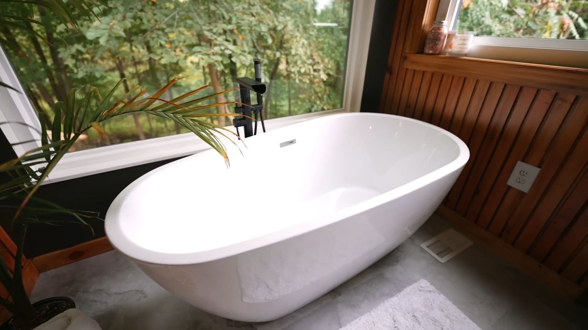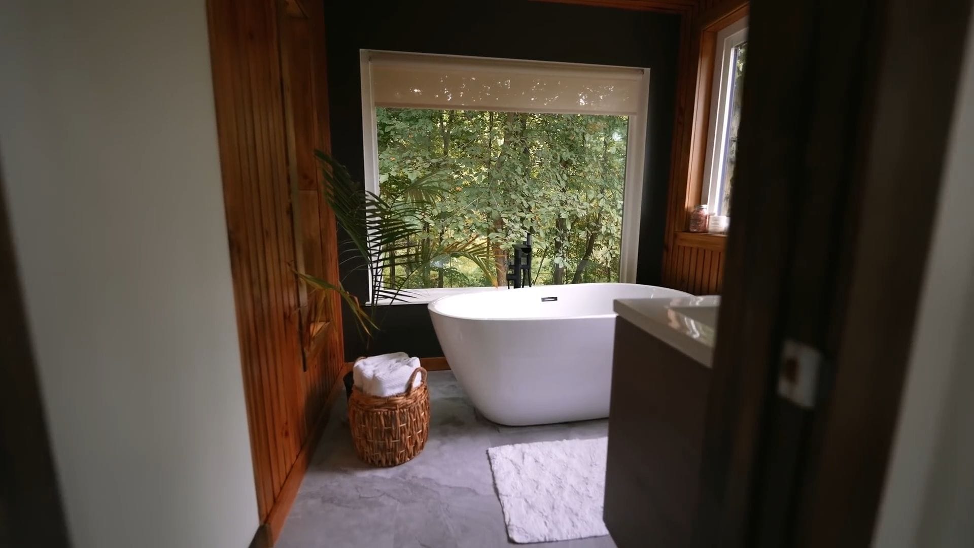 A luxurious freestanding bathtub with an elegant floor-mounted faucet creates an immediate focal point that speaks to relaxation and indulgence. The tub is surrounded 360 degrees by rich wood paneling that adds warmth and sophistication to the space.