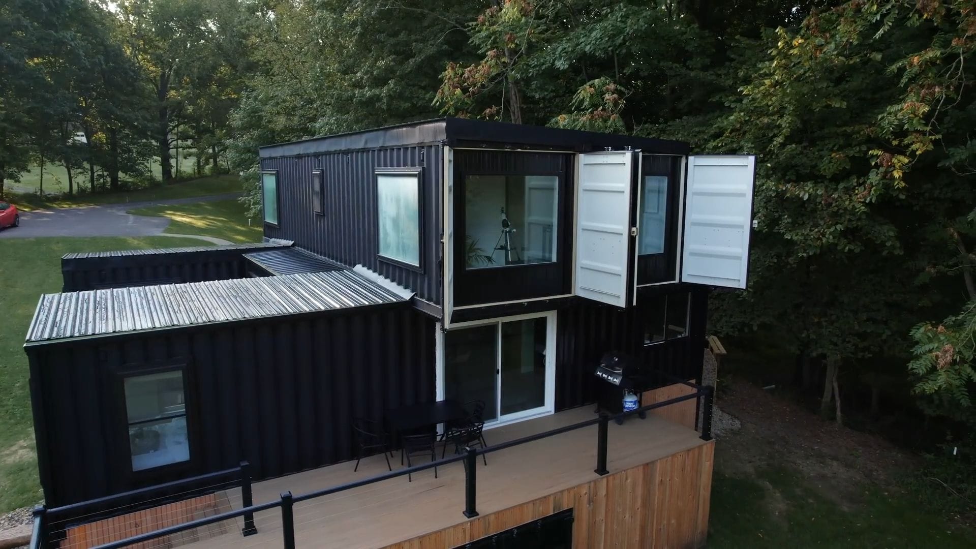 The upper deck area expands your outdoor options with a dining table and full grilling station, plus you can admire those authentic shipping container doors positioned directly overhead.