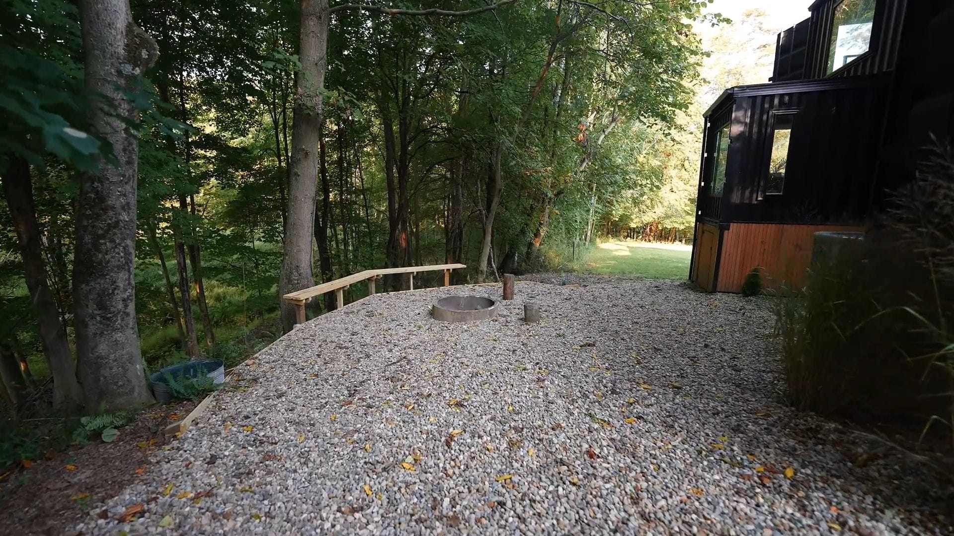 Behind the home, a fire pit area comes complete with provided firewood and sits near a natural creek that runs through the back of the property.
