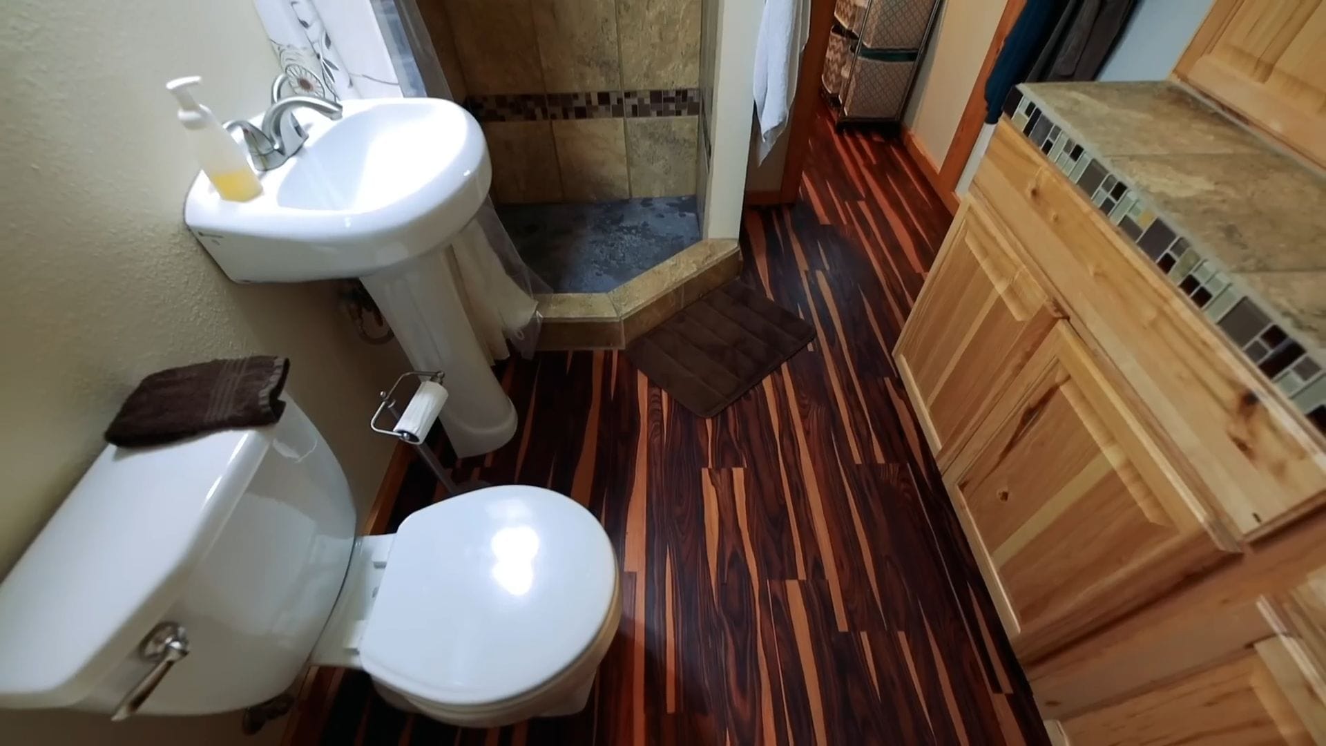 The bathroom showcases thoughtful planning with a pedestal sink that prevents the space from feeling cramped with wall-to-wall cabinetry. The custom-built shower was actually constructed as part of the owner’s recovery process after a serious medical emergency, making it even more meaningful.