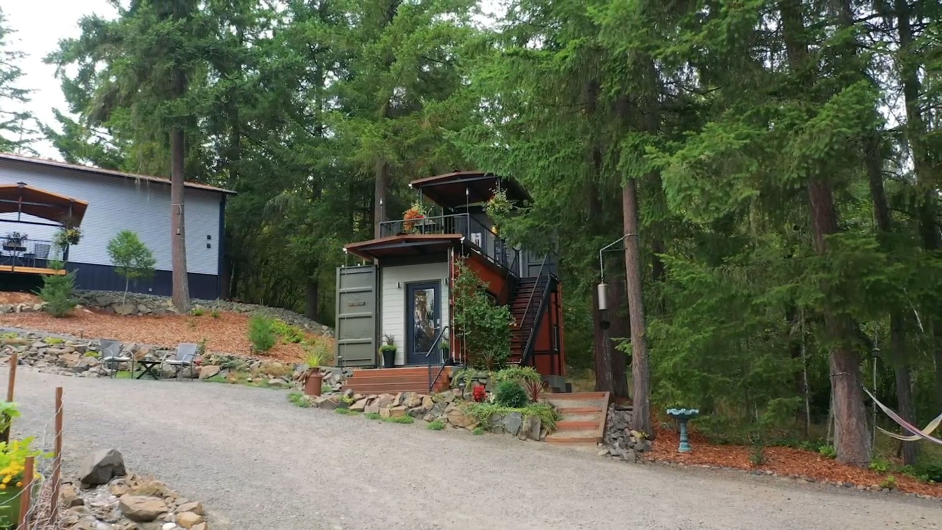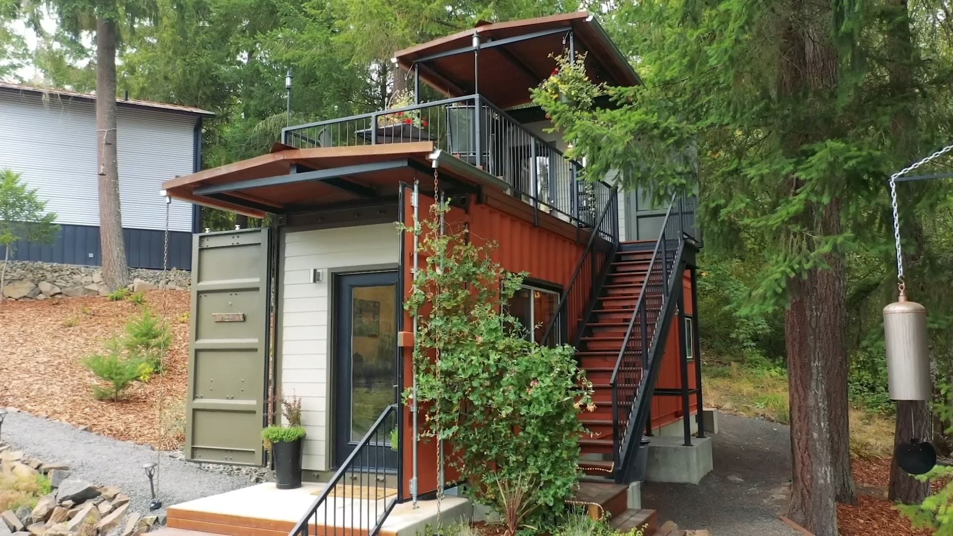 As we approach this striking two-story structure, the brilliant design immediately catches your eye with the smaller container stacked perfectly atop the larger one. The contrasting metal surfaces have weathered beautifully, blending harmoniously with the surrounding woodland setting.