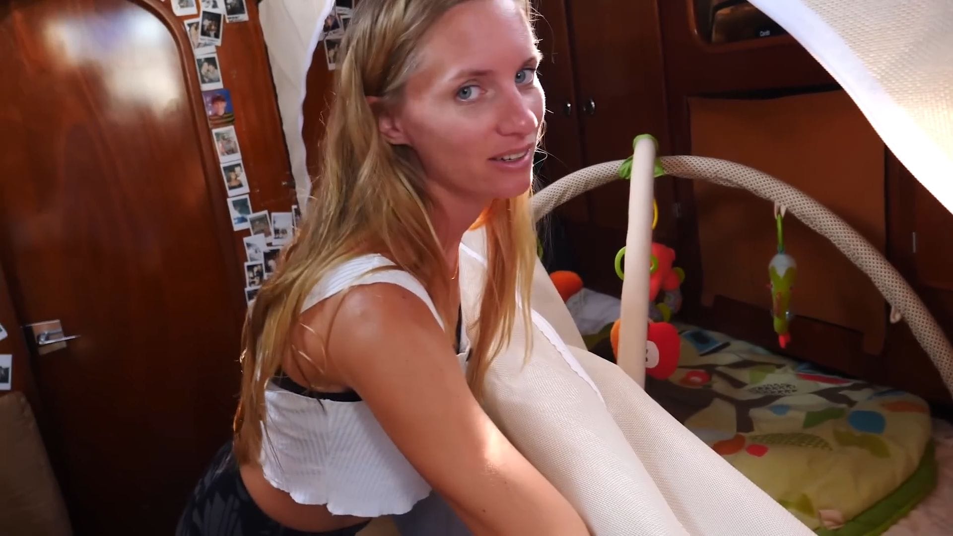 Each side of the sofa conceals deep freezer compartments, currently running a bit low since they haven’t provisioned in about a month, but essential for storing large fish catches and long-term supplies. The port side has been converted into Sierra’s play area, complete with a custom playpen that keeps her safe while remaining part of the action.