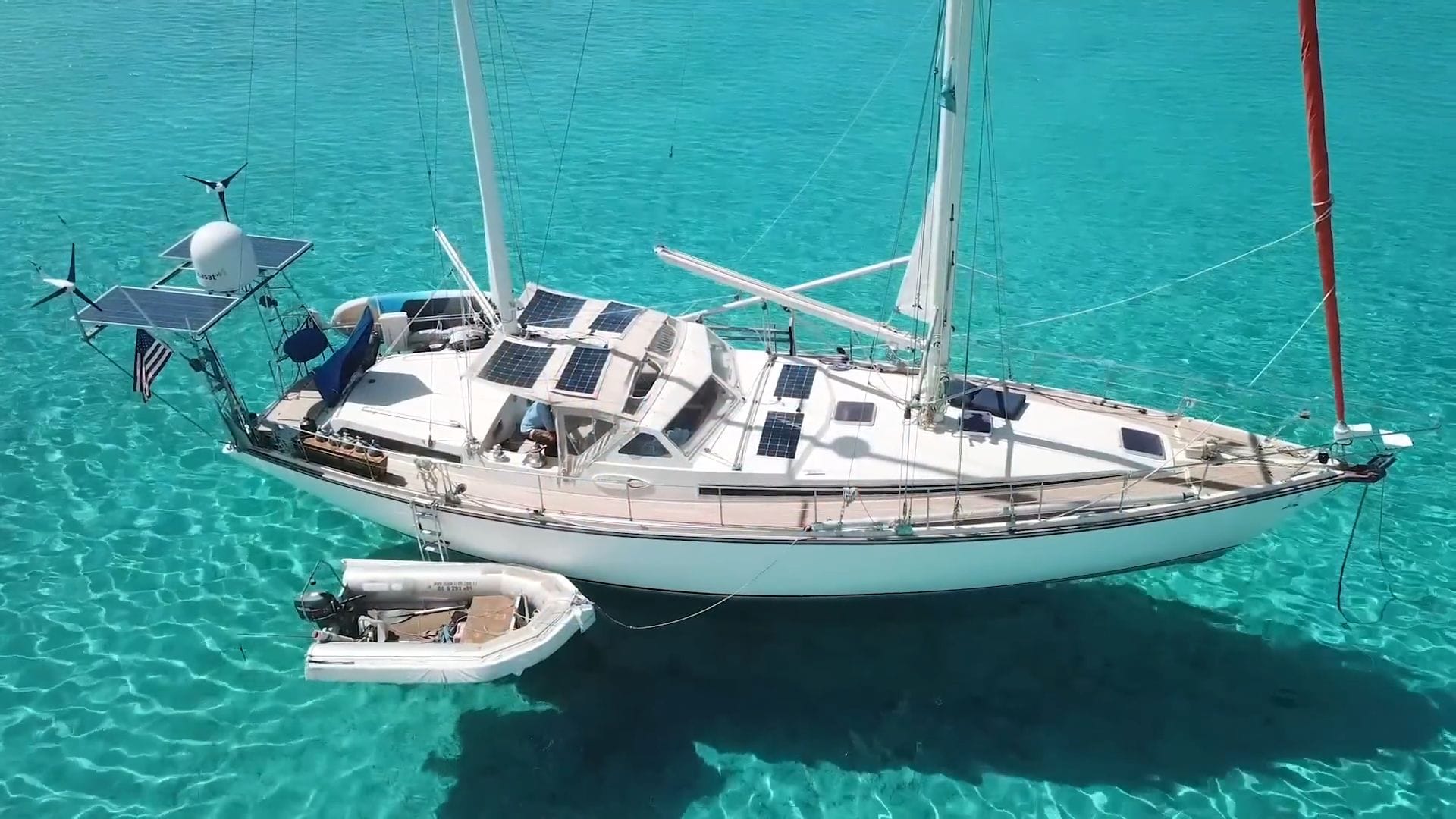 Up on deck, their energy independence becomes clear with 1400 watts of solar panels and dual 400-watt wind generators keeping the batteries charged. The gimballed satellite dome provides broadband internet anywhere they roam, essential for their video production work that funds this incredible lifestyle.