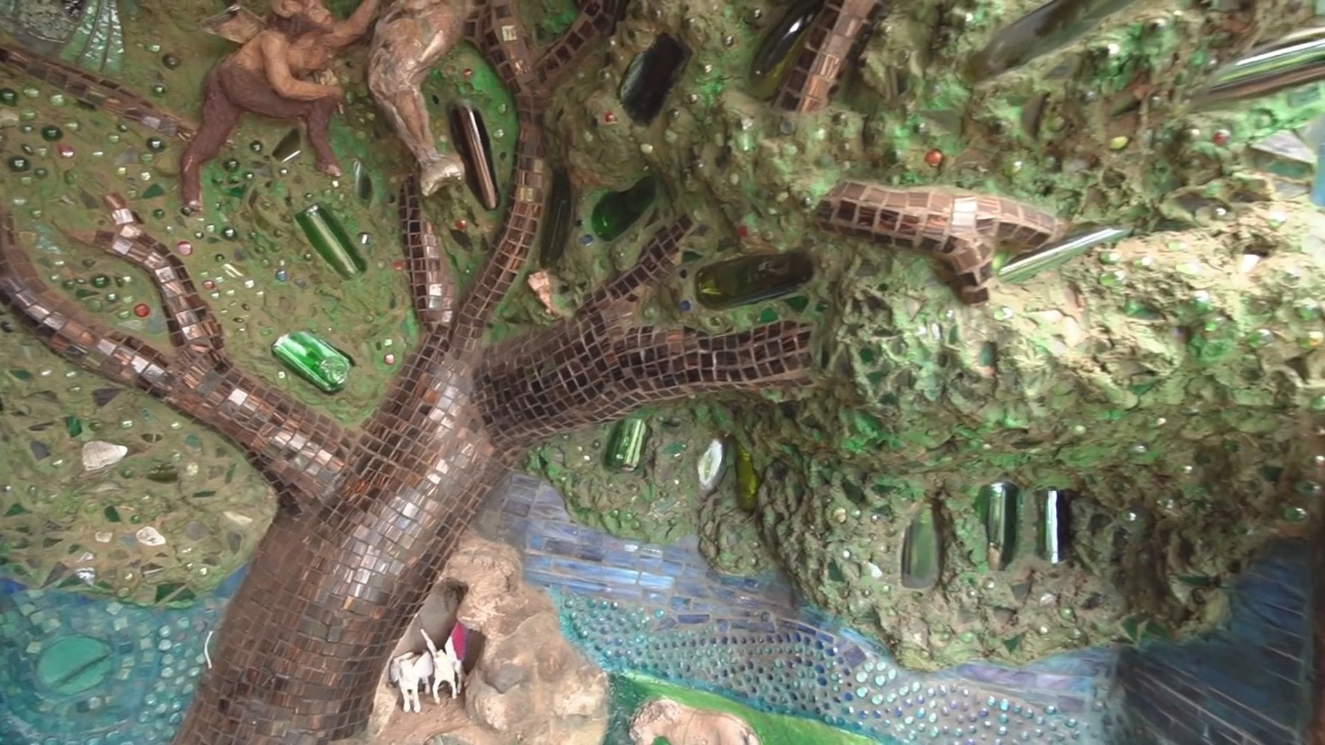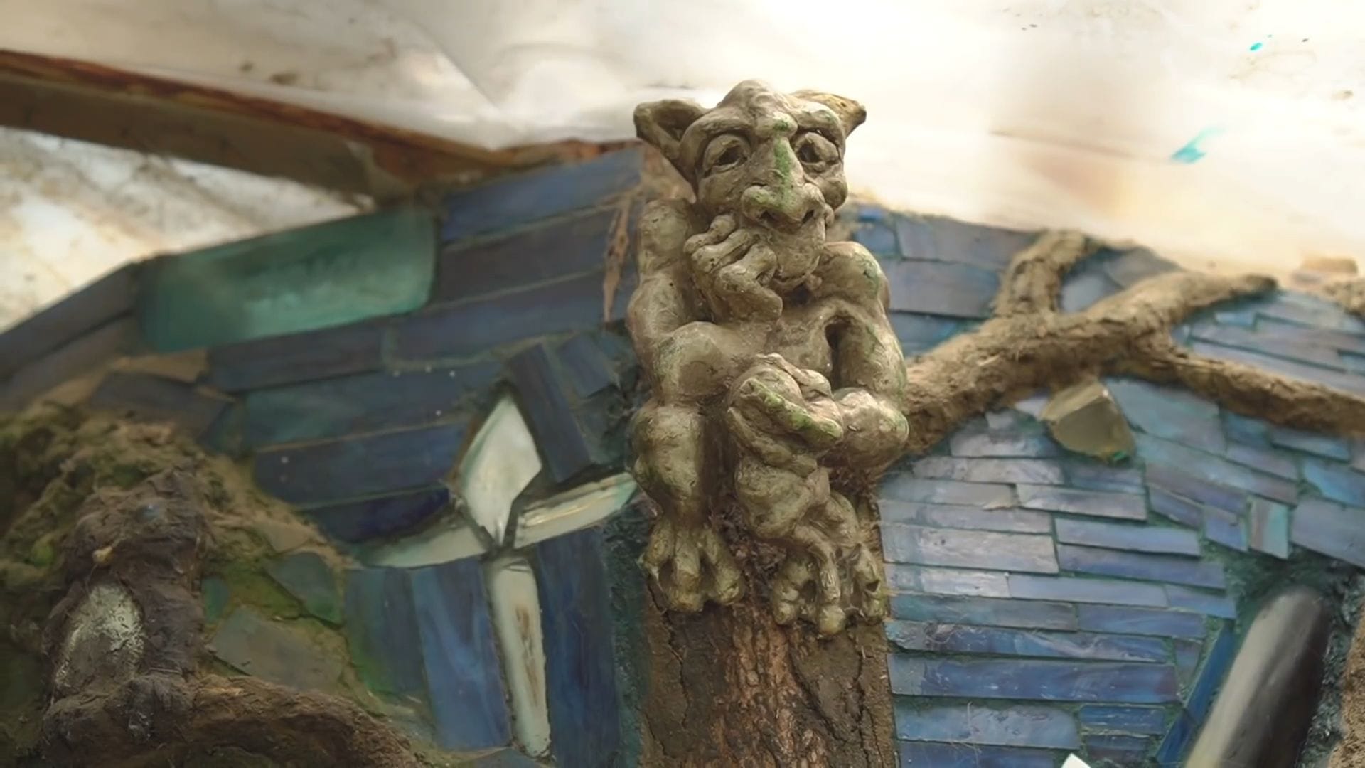 When the homeowner cobbed over the original chimney, it started resembling a tree, so he sculpted it into this magnificent focal point that took years to complete with his mother-in-law.
