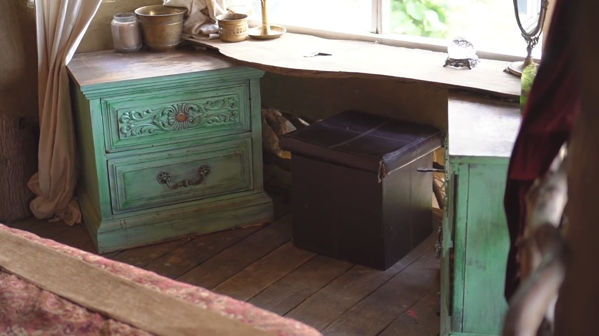 Every surface tells a story of resourcefulness and creativity – the dark wood throughout the home is stained with walnut dye made from black walnuts they boil themselves, creating this beautiful antique appearance.
