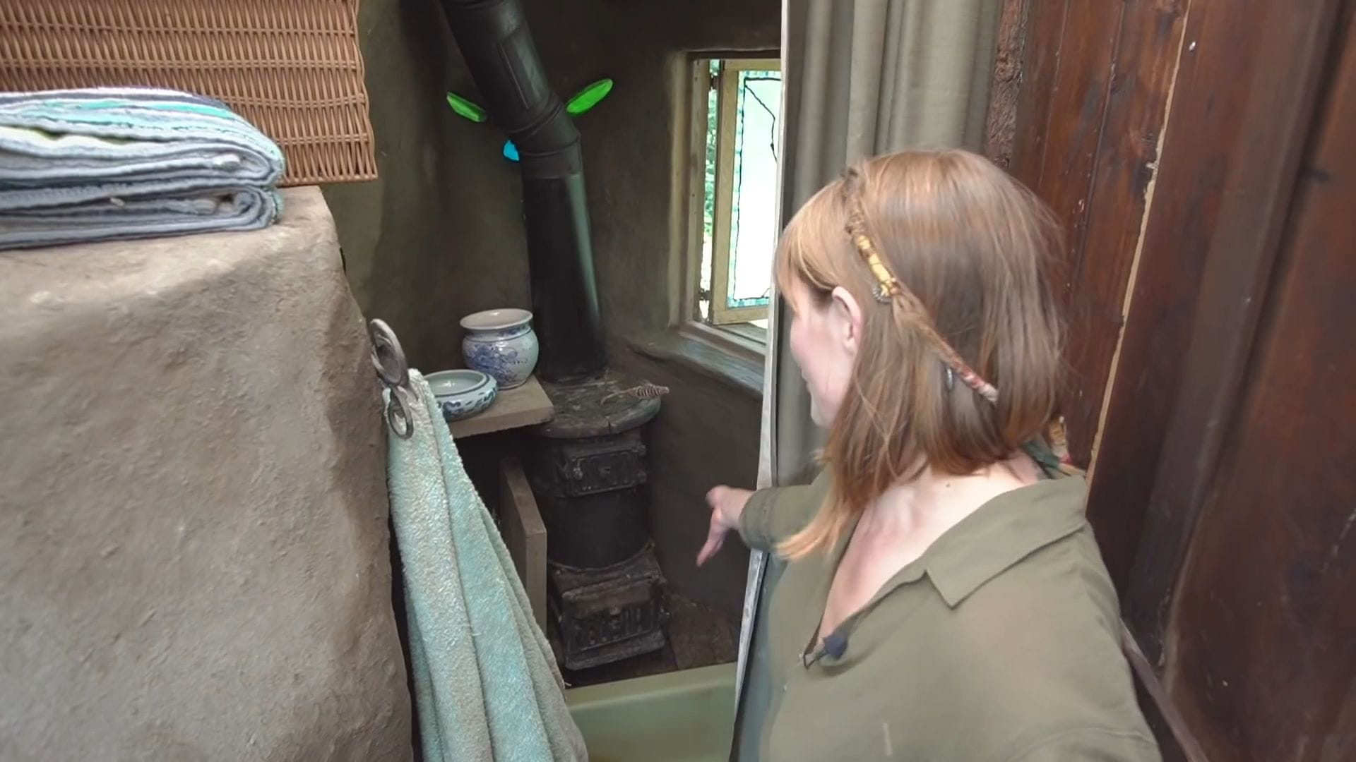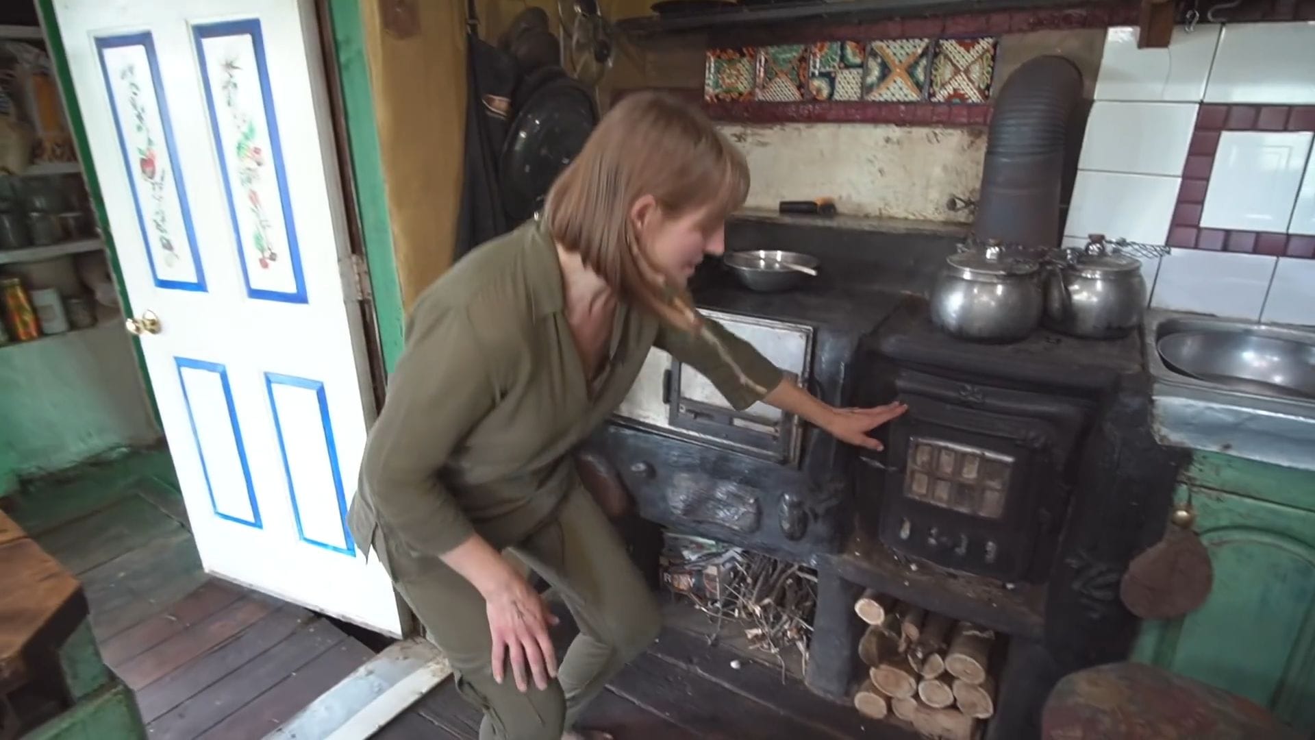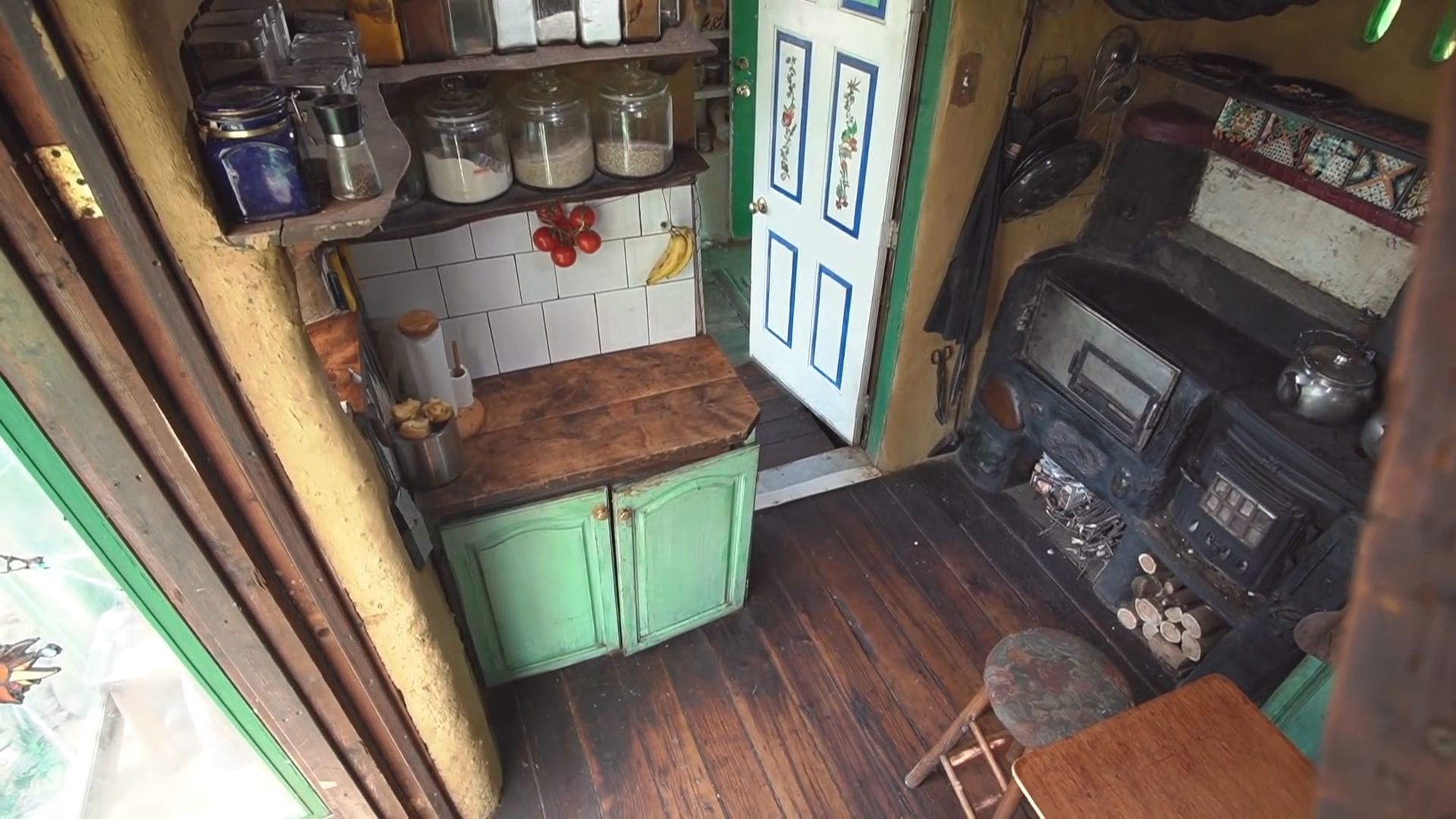 The clever wood storage system beneath the stove uses heat from above to dry freshly collected wood, ensuring they always have dry fuel ready even when harvesting wood during ice storms.