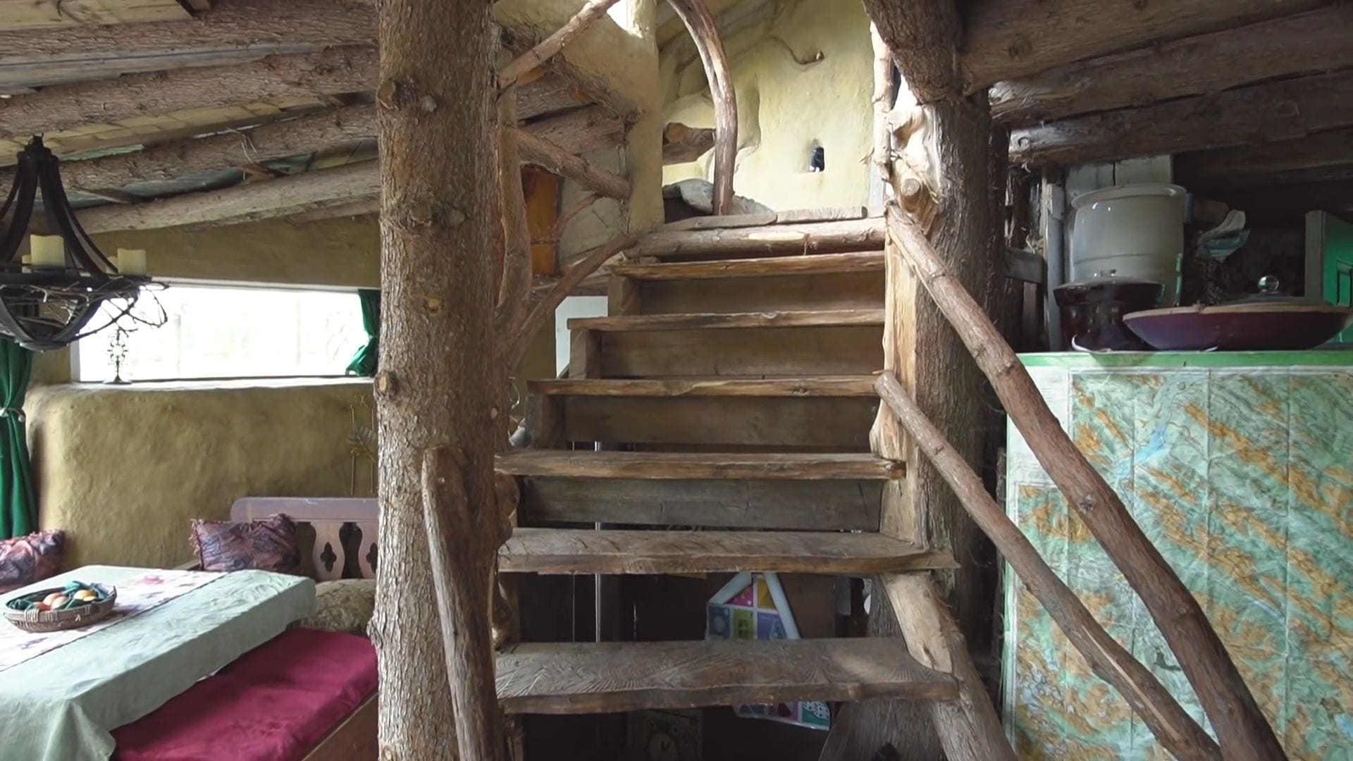 The custom staircase wrapping around this central tree demonstrates incredible craftsmanship, with each board hand-cut from cedar logs using just a chainsaw and square.