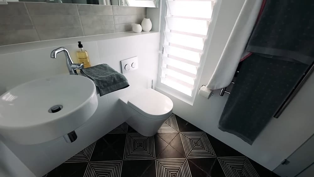 The bathroom showcases how thoughtful design can create luxury in minimal space. Custom tilework adds visual interest without overwhelming the room, while the layout maximizes every square inch through strategic placement of fixtures and storage solutions.