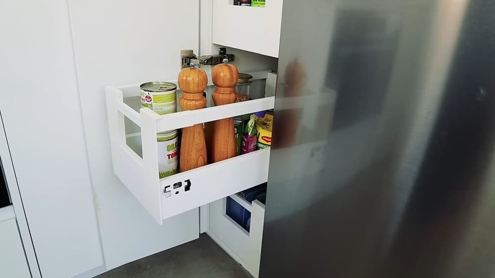 Storage solutions throughout the kitchen exceed what many larger homes provide, with a long pantry and carefully planned cabinet systems. Unlike their previous oversized pantry filled with expired goods, this compact version stays organized and functional, with hidden power outlets and switches keeping surfaces clean and uncluttered.