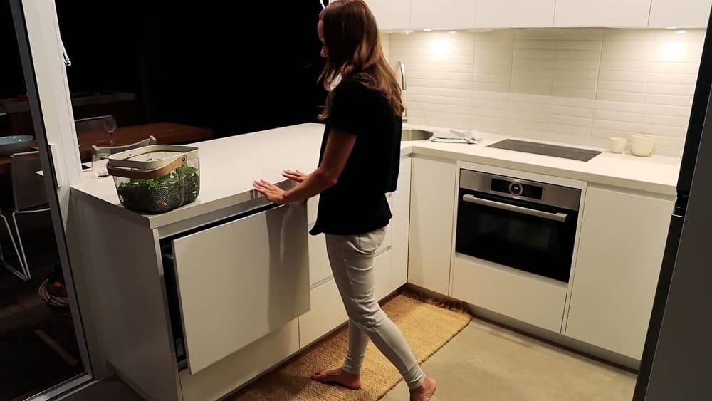 Despite the compact footprint, the kitchen maintains full functionality for a family that cooks regularly. A two-burner cooktop, combination microwave oven, and perfectly-sized dishwasher drawer handle daily meal preparation, while a smaller refrigerator required some adjustment but now suits their streamlined lifestyle perfectly.