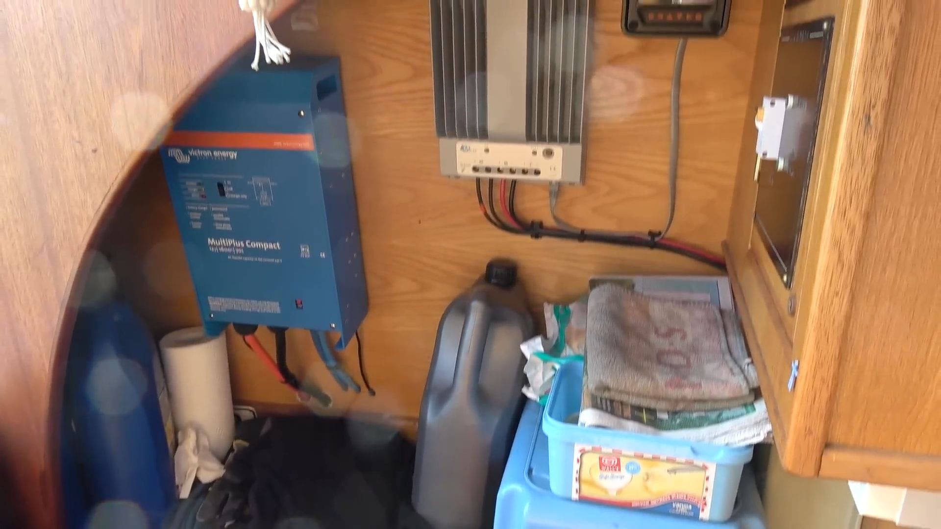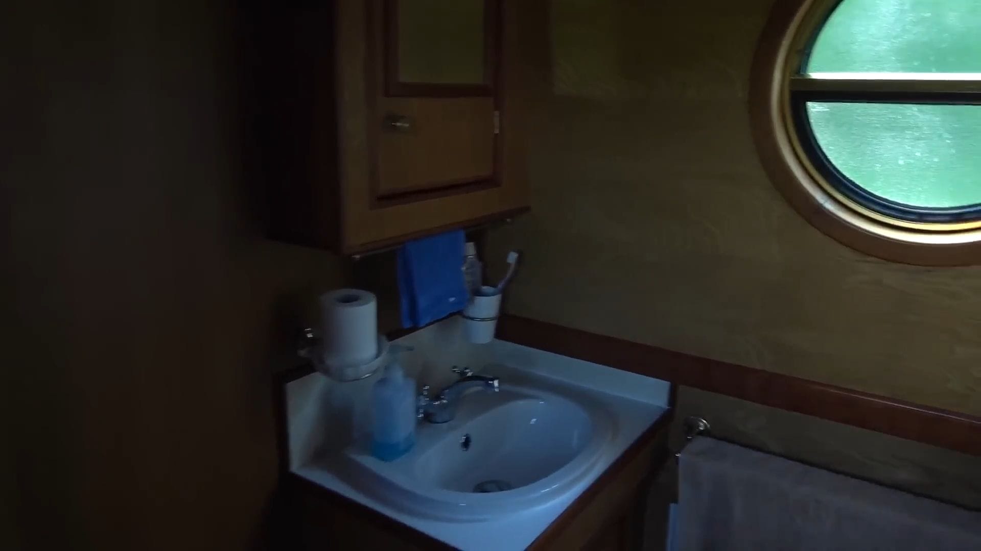 Additional cupboards line the corridor leading toward the boat’s private quarters, maximizing storage throughout the narrow space. The compact bathroom features a sink with storage above and below, plus a cassette toilet system that requires emptying every few days.