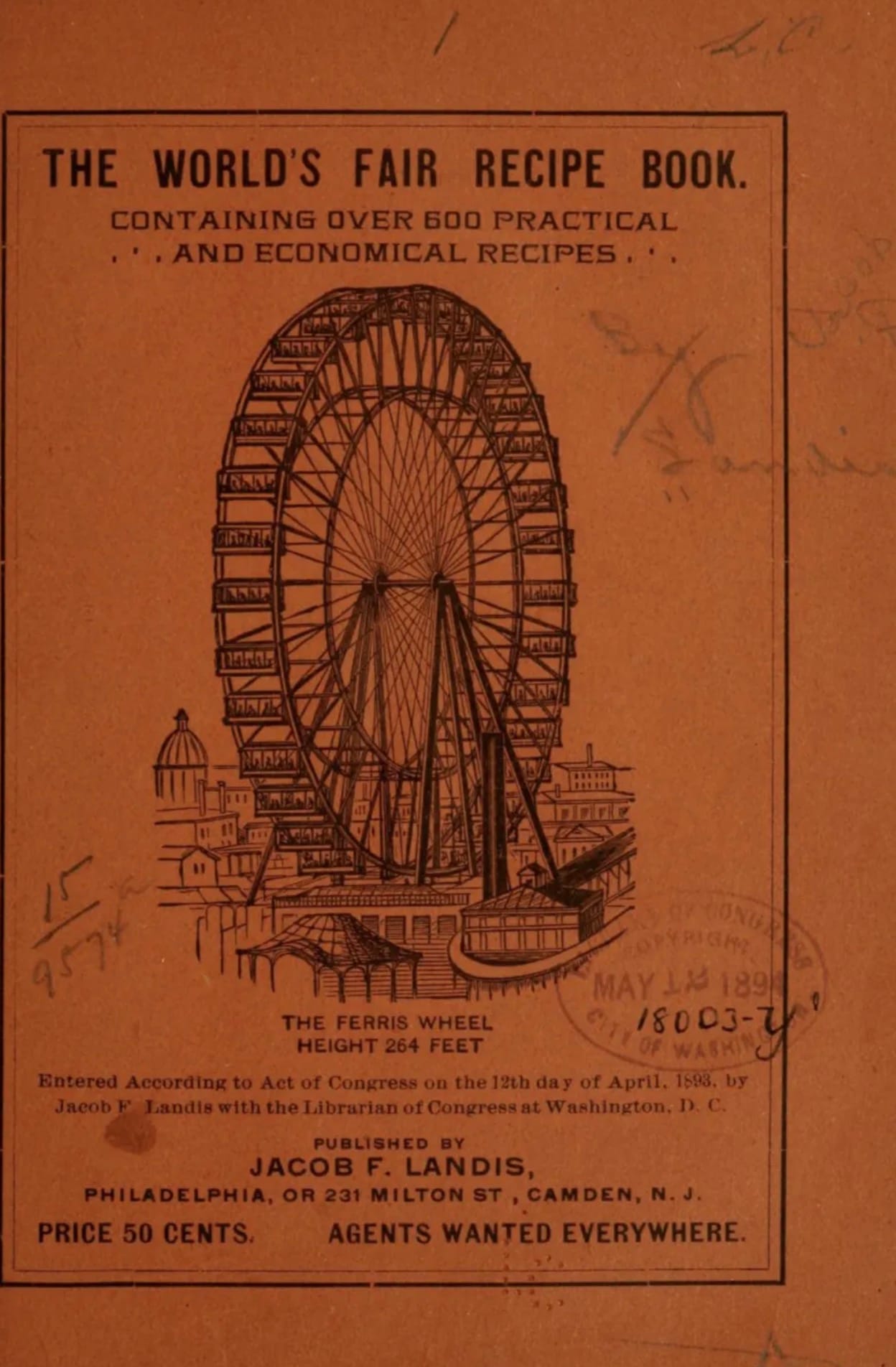 Oh my goodness – I just discovered something amazing! This beautiful cookbook from the 1893 World’s Columbian Exposition in Chicago, complete with an illustration of the original Ferris Wheel on the cover (fun fact: that was actually the very first Ferris Wheel ever built!).