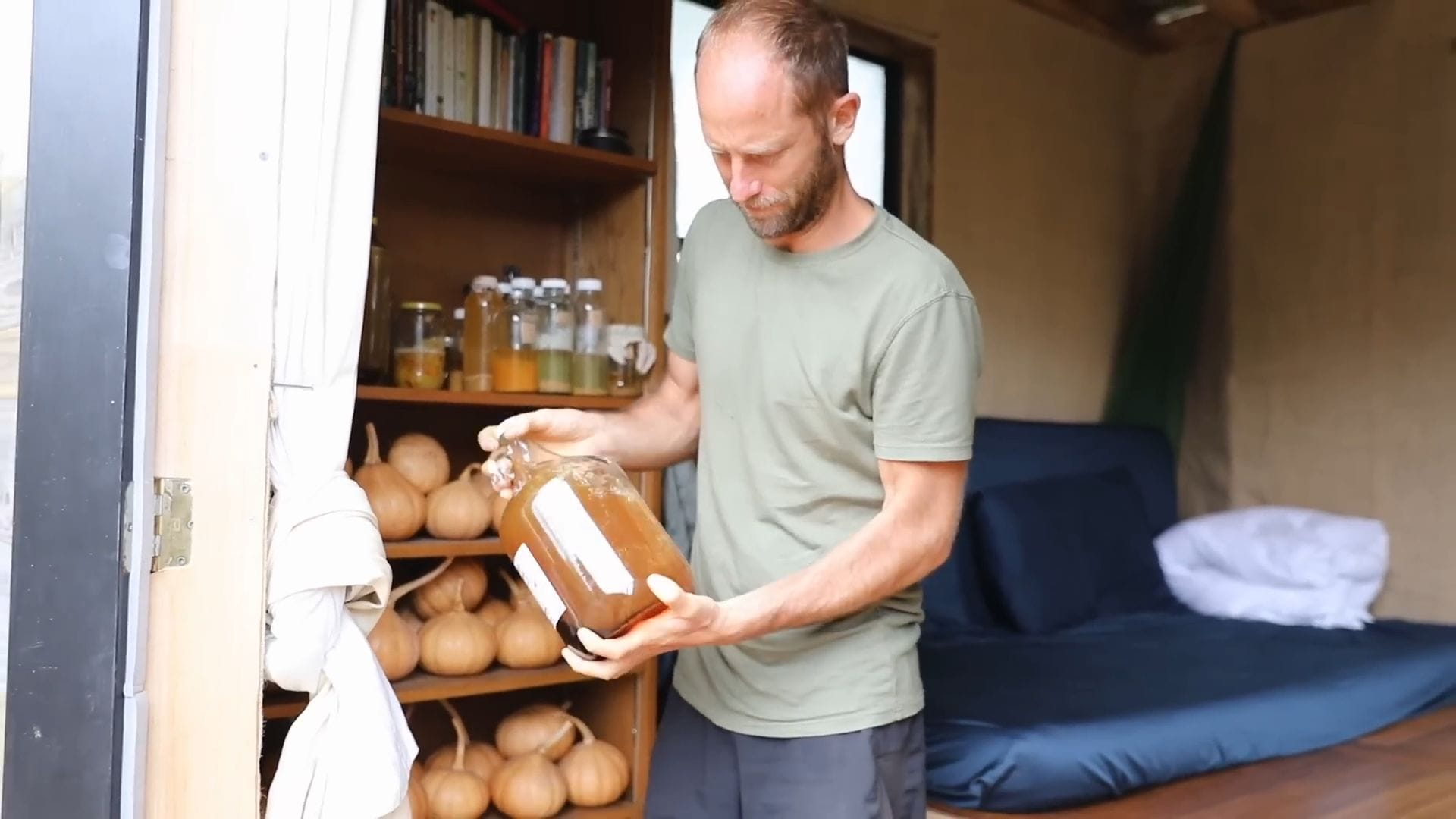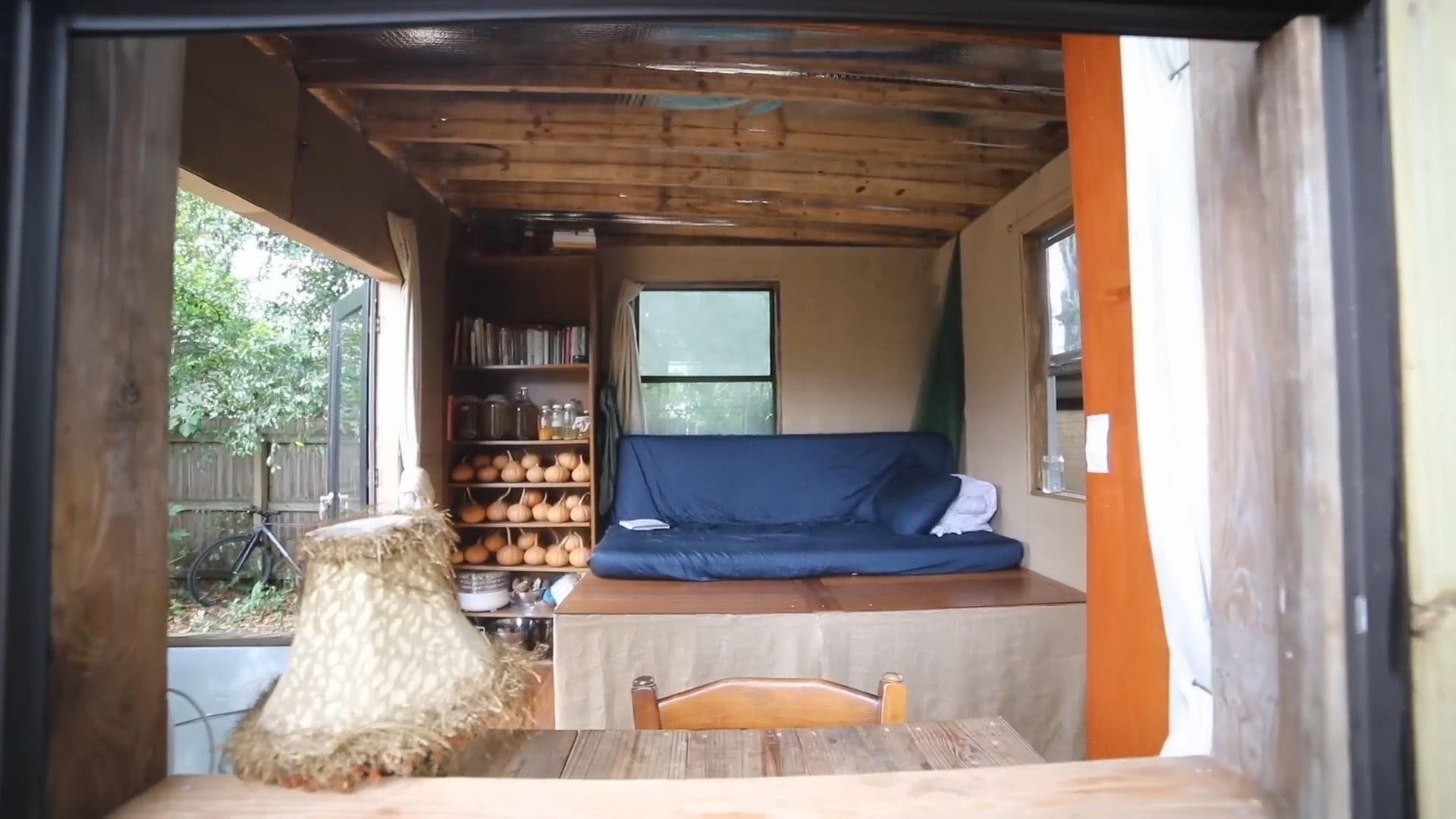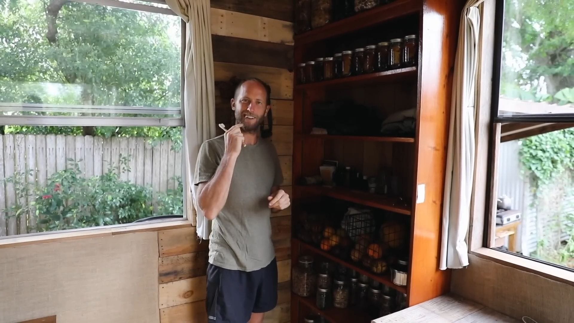 The real star of this tiny house isn’t furniture – it’s food storage, supporting Rob’s incredible project of growing and foraging 100% of his food for an entire year.