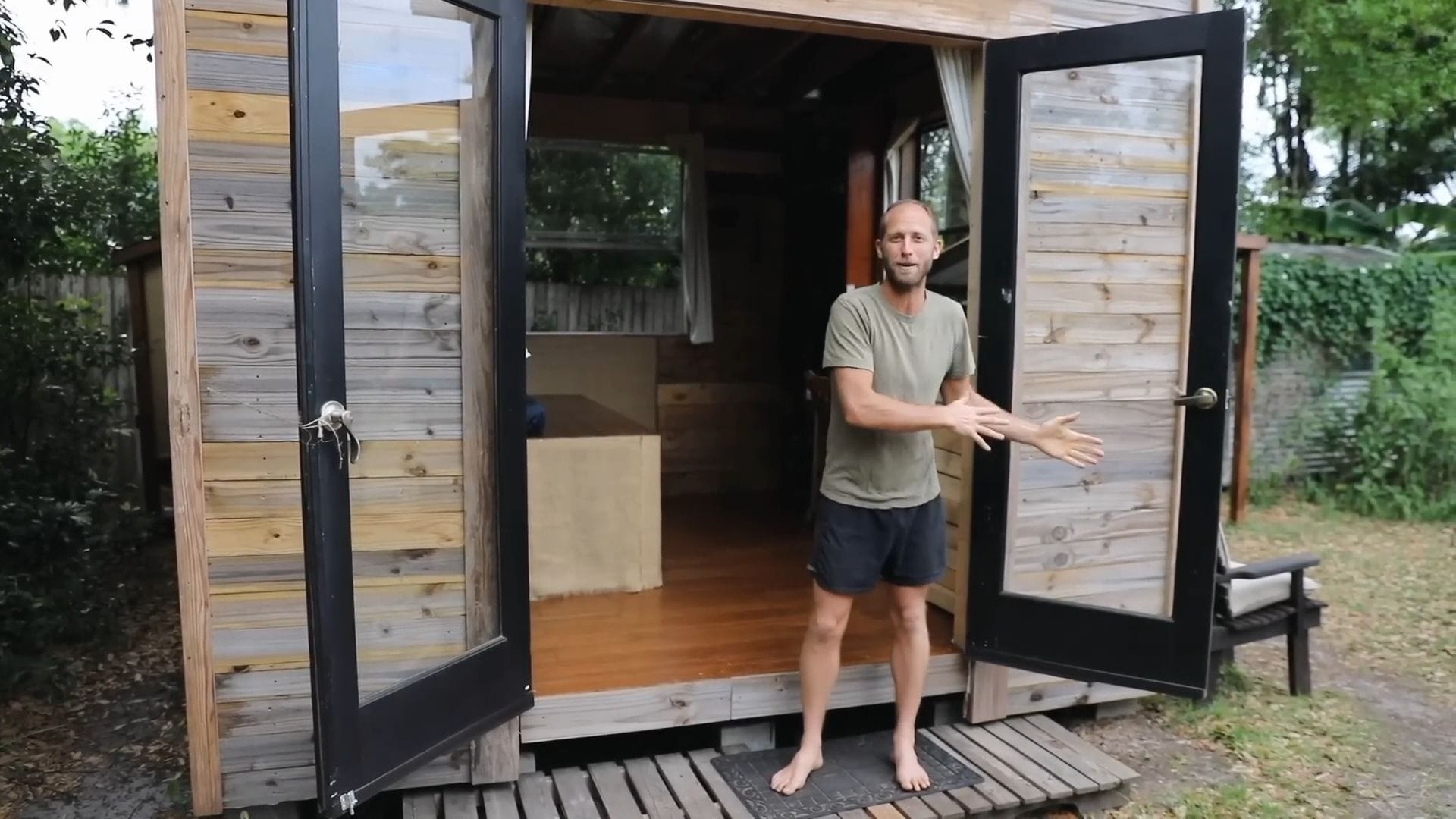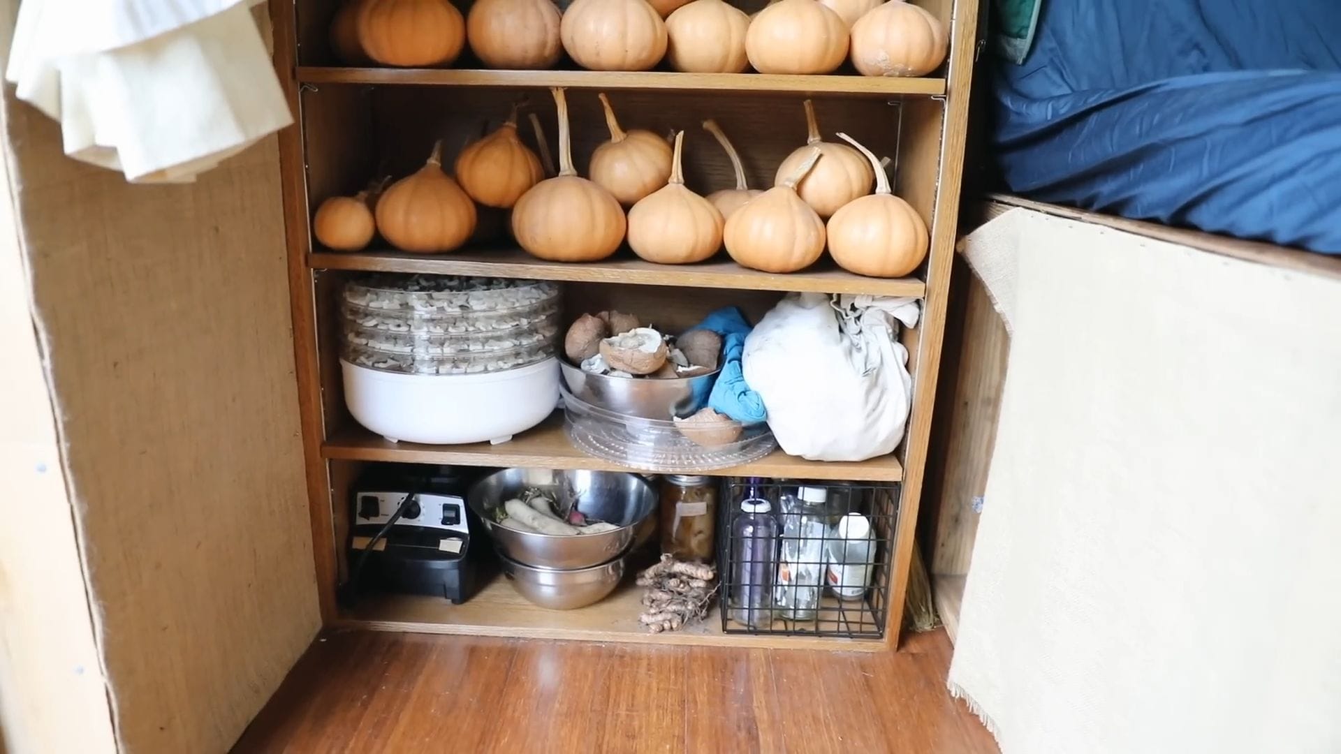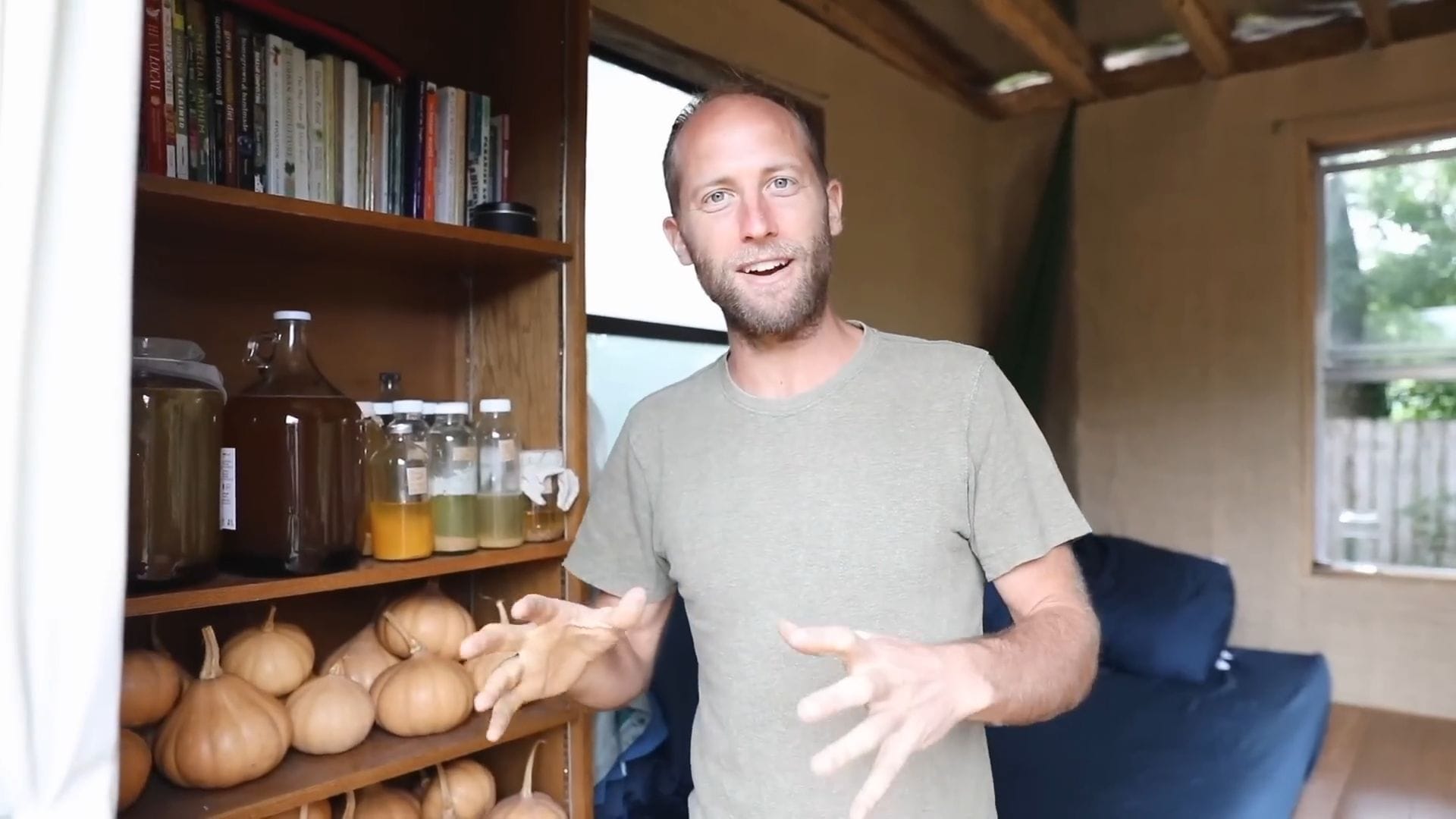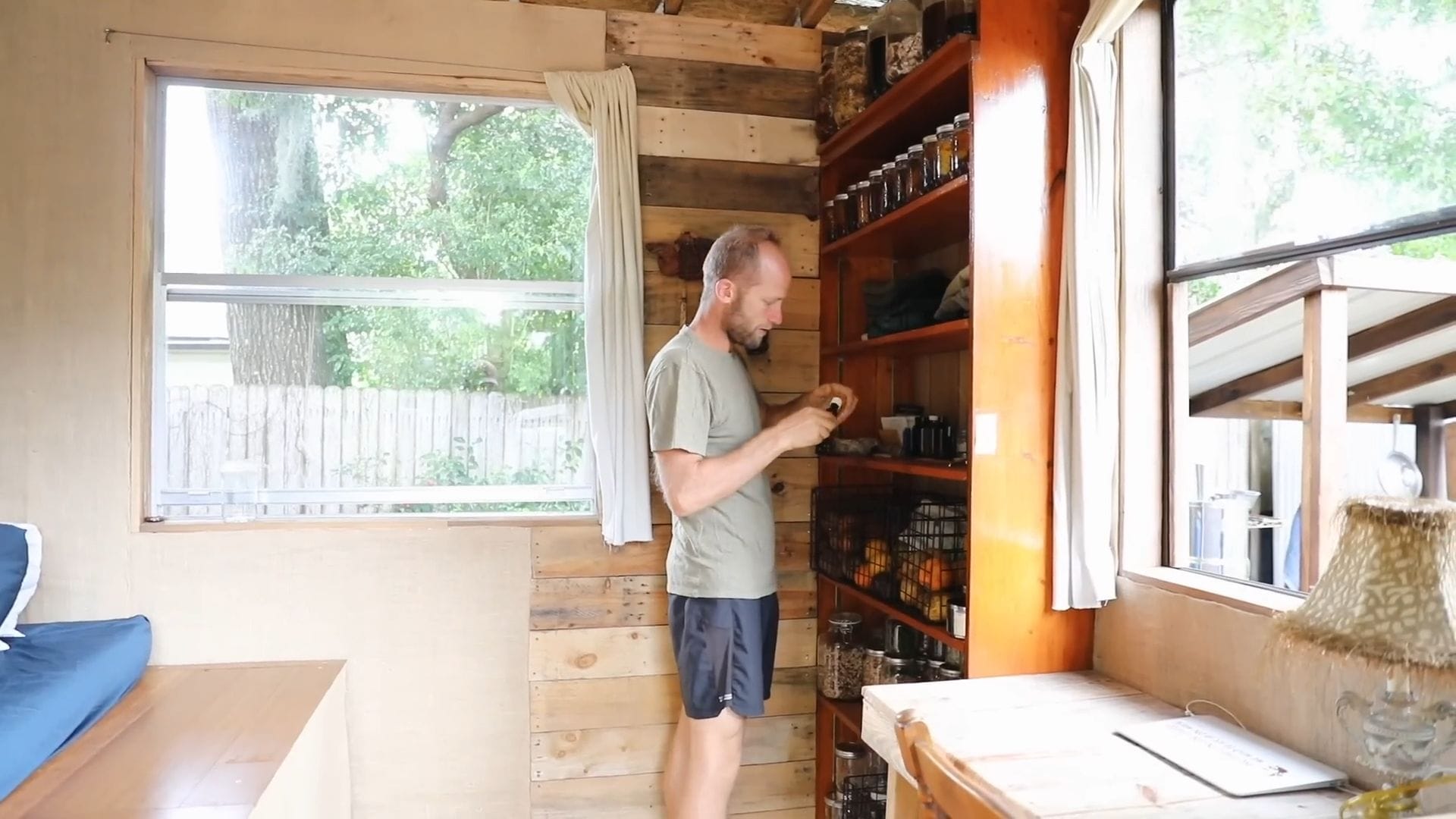 The real star of this tiny house isn’t furniture – it’s food storage, supporting Rob’s incredible project of growing and foraging 100% of his food for an entire year.