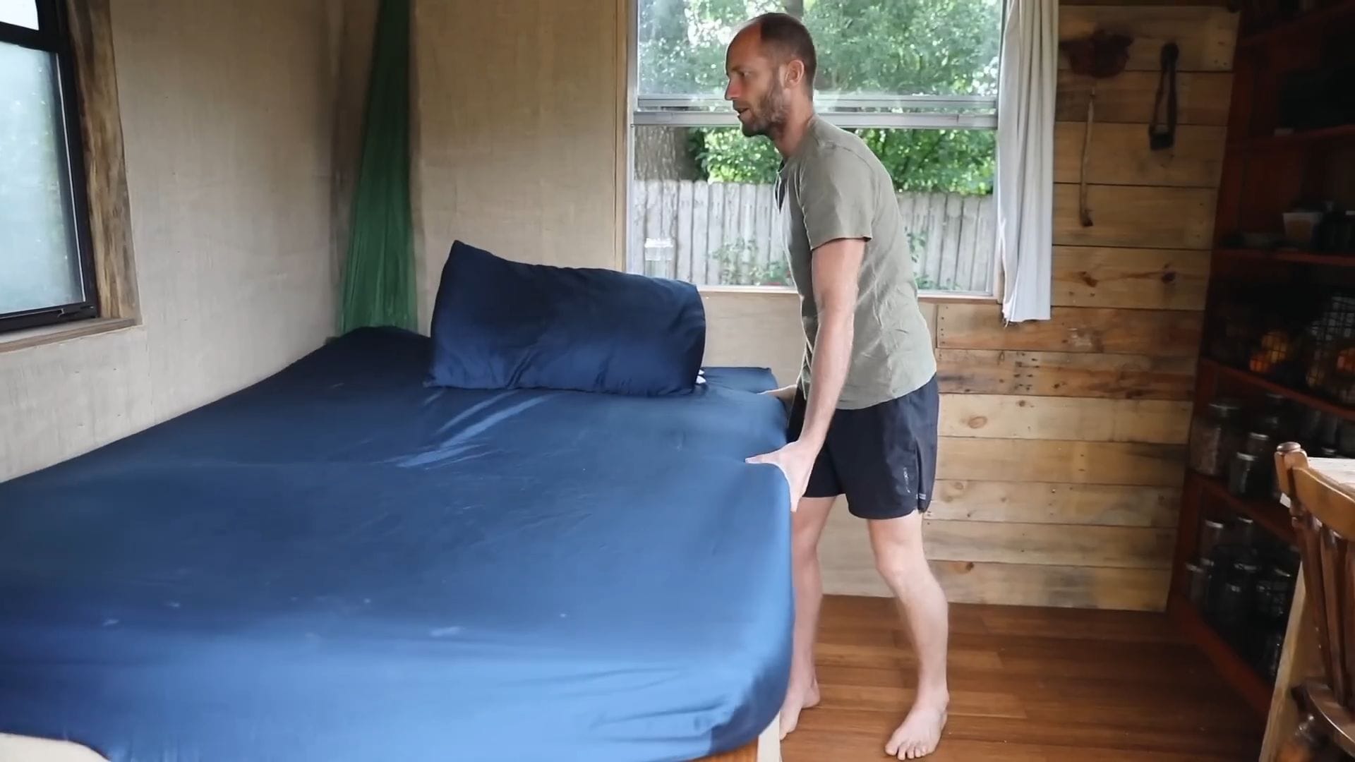 A mosquito net provides essential protection in this screen-free environment, though Rob admits the mosquitos were quite challenging during his first summer.