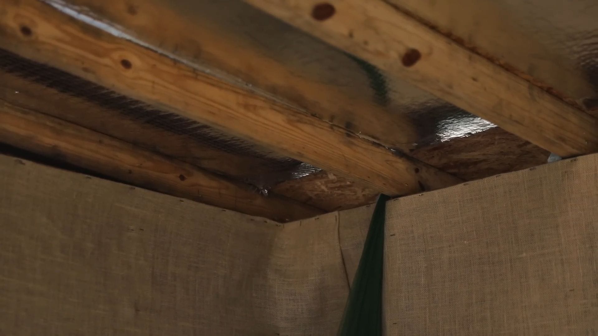 Without air conditioning or traditional insulation, the space relies on burlap coverings that improve aesthetics while maintaining maximum ventilation.