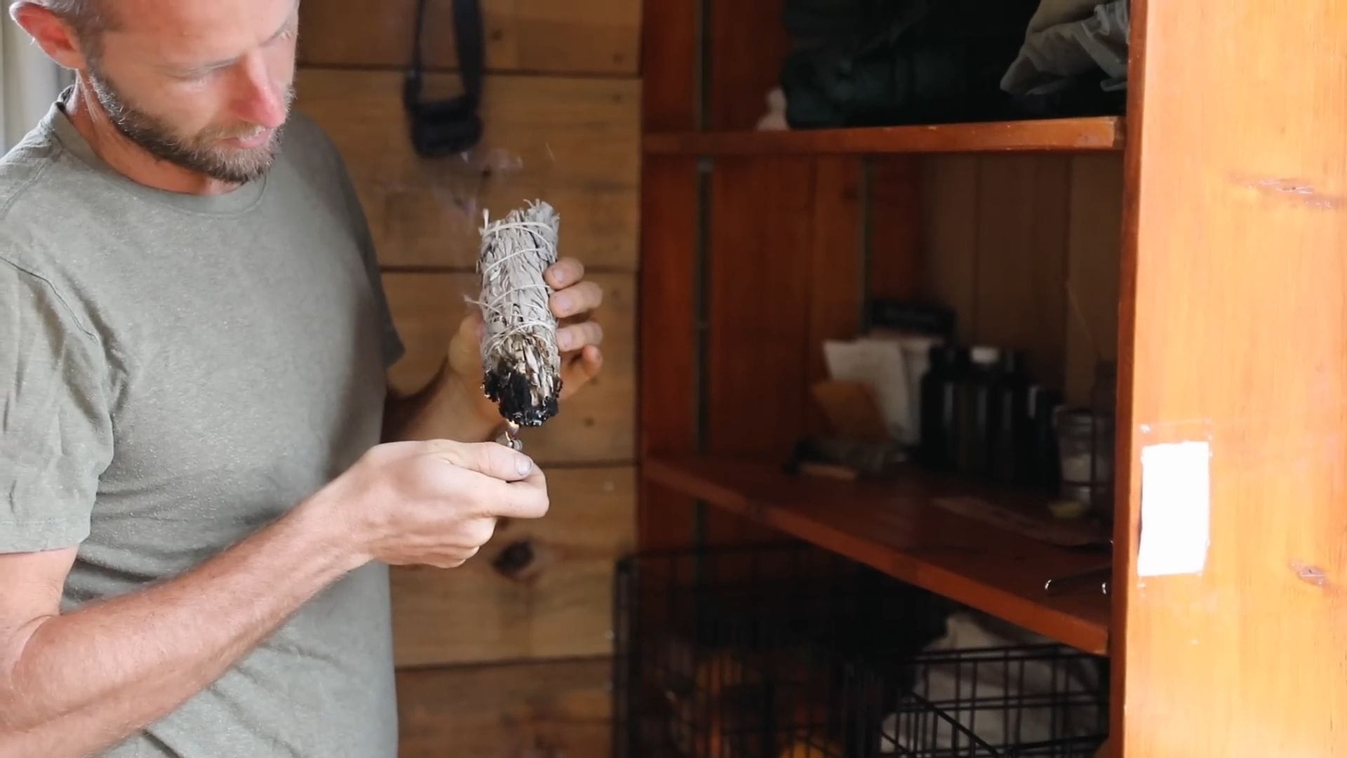 This single clothing shelf holds Rob’s entire wardrobe, proving that living simply doesn’t mean living without style.