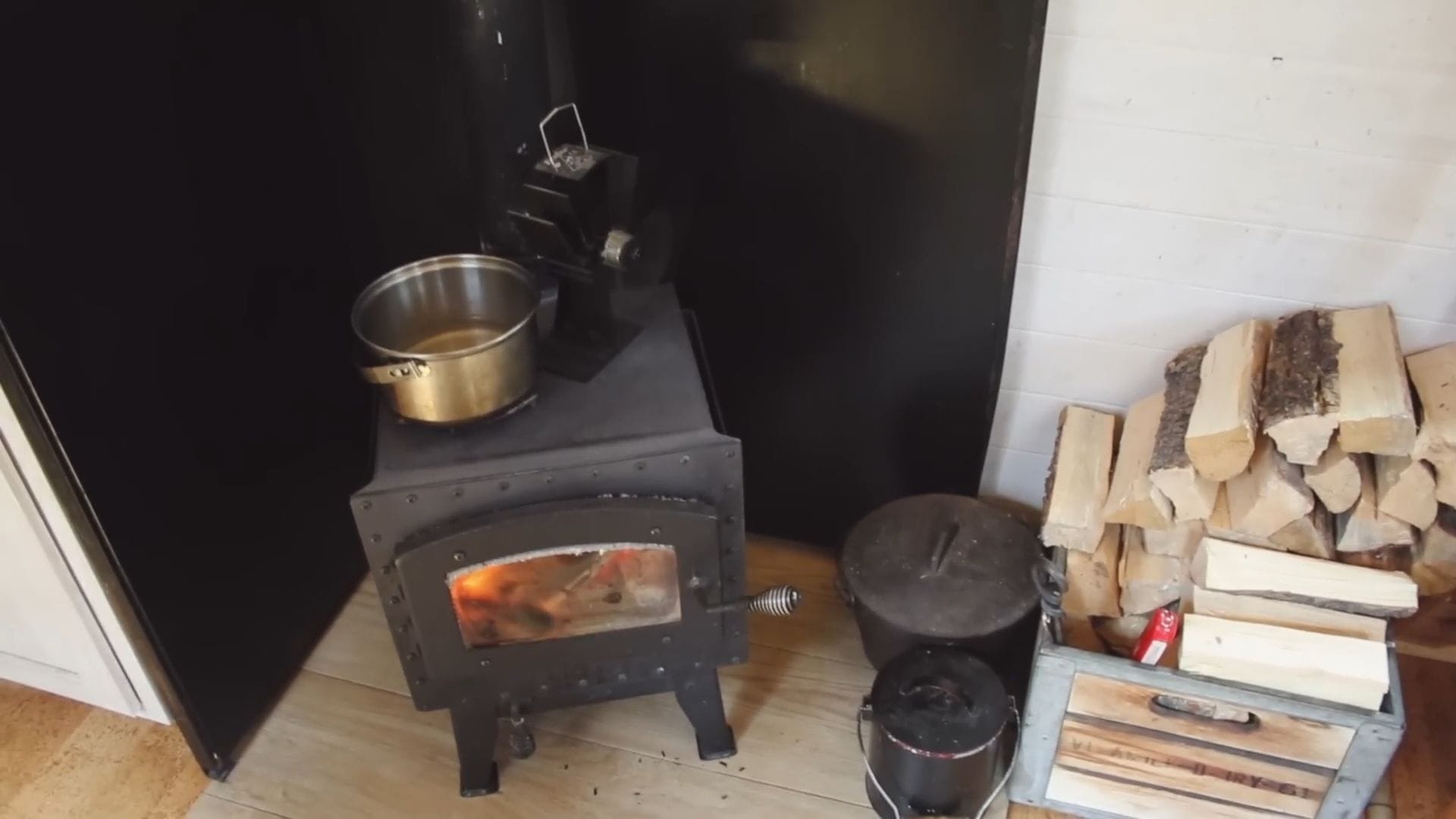 The original propane heater under the stairs required electricity to run its fan, but the addition of the wood stove has been transformative.