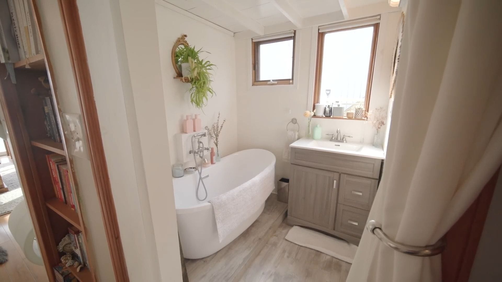 Unlike ocean-going sailboats where everything must be secured against constant motion, this houseboat offers stability with only gentle lateral movement during storms. The single bathroom showcases the “small but functional” theme that runs throughout this home, featuring a bathtub-only setup that has converted Kate into a devoted bath person. A shower attachment addition is planned for the future to provide more bathing options.