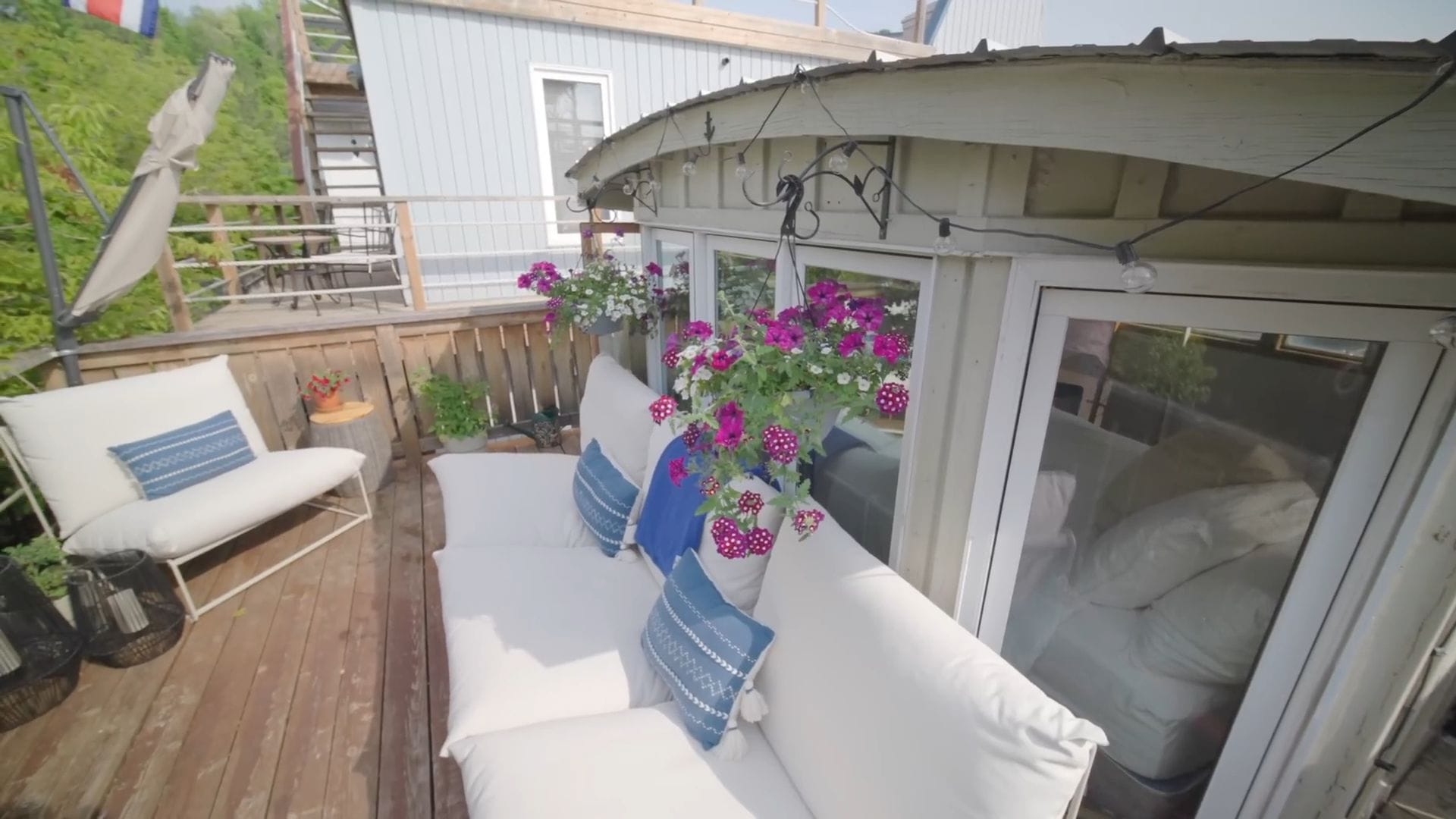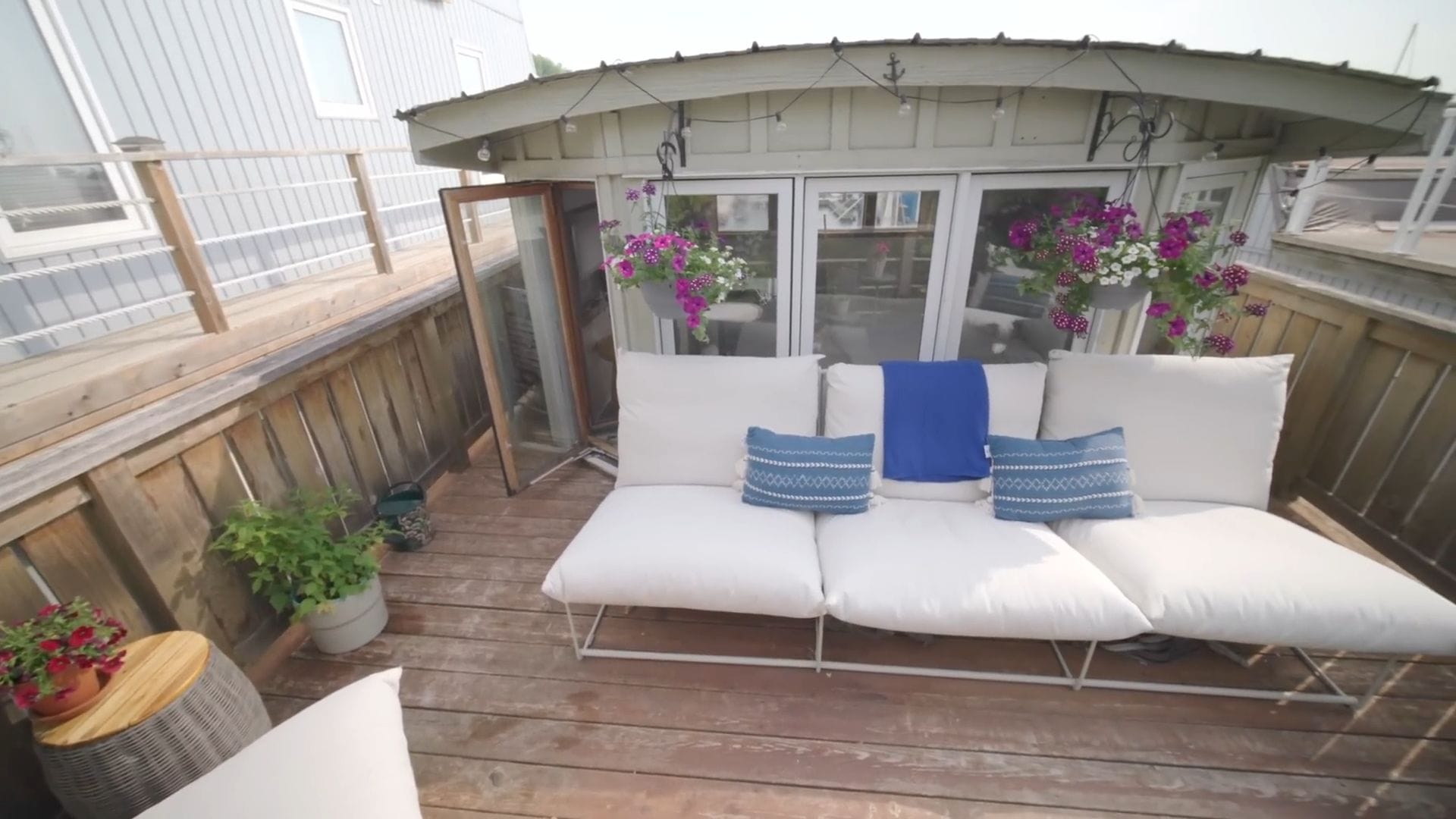 Power, high-speed internet, and all utilities connect directly from the dock, making this floating lifestyle surprisingly convenient and connected. The dock community includes 25 float homes alongside Kate’s houseboat, with the unique advantage of being positioned right on fixed land. This prime location allowed for the construction of a practical back deck, which Kate built with her father and brother immediately after moving in.