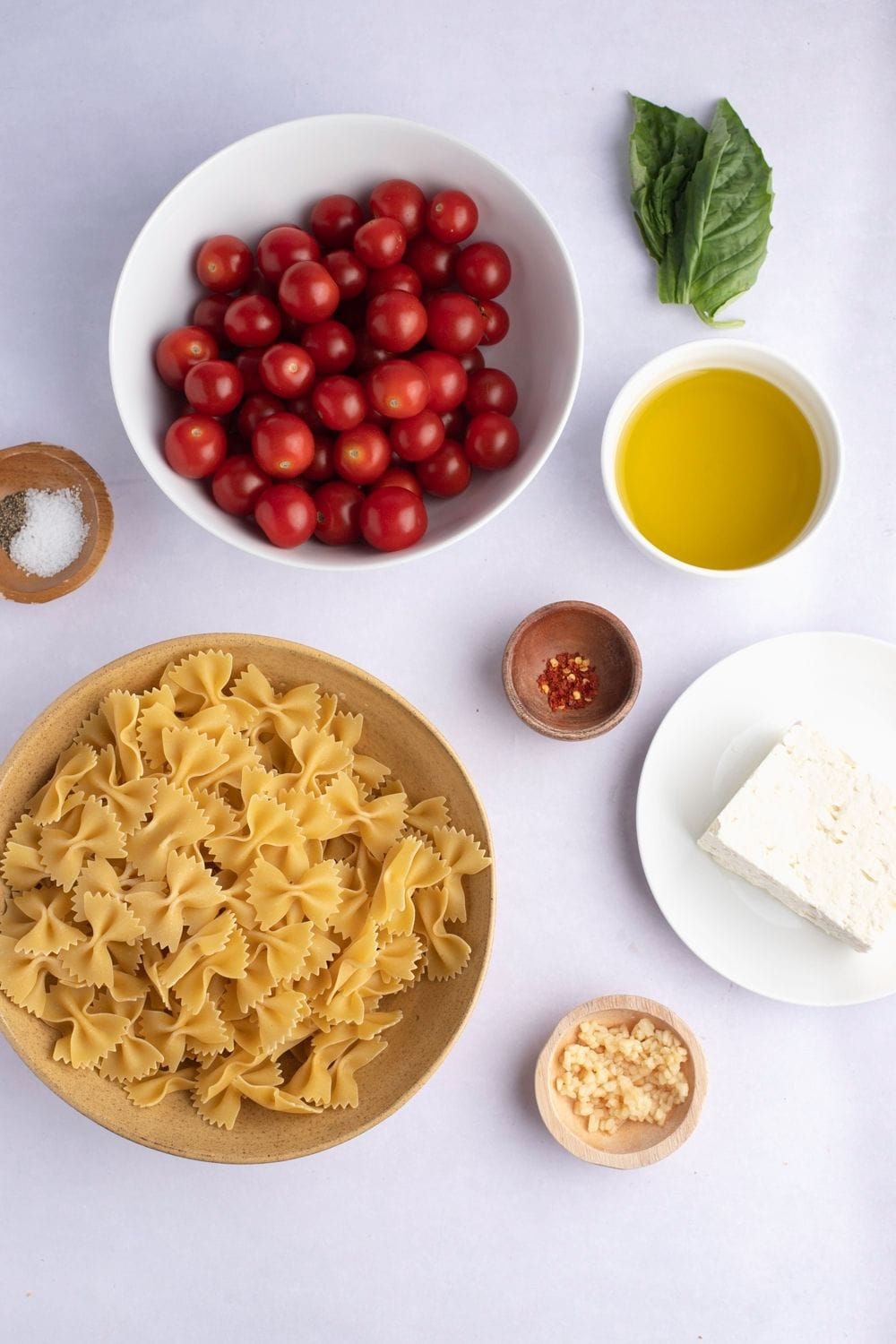 You might already have some of these items in your kitchen. The star ingredients are the feta cheese and cherry tomatoes. Make sure to get a block of feta, not crumbled, for the best results.