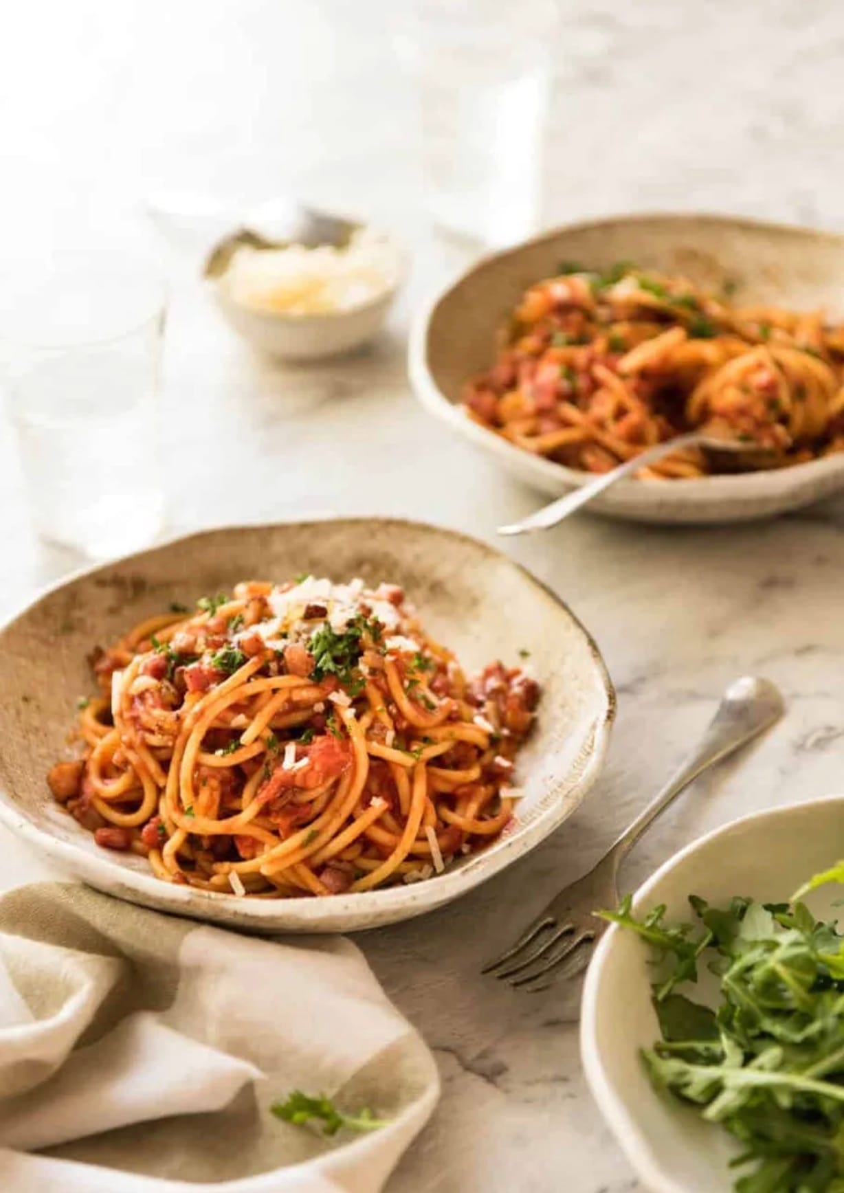 The sauce comes together quickly with canned tomatoes and a splash of pasta water. It’s a great option for busy weeknights when you want something delicious but don’t have much time to cook.