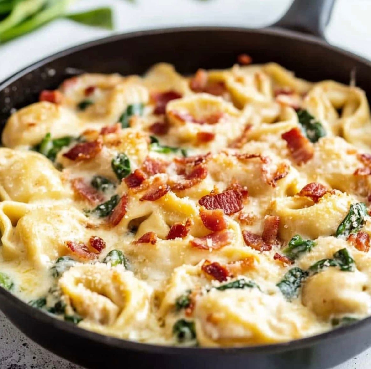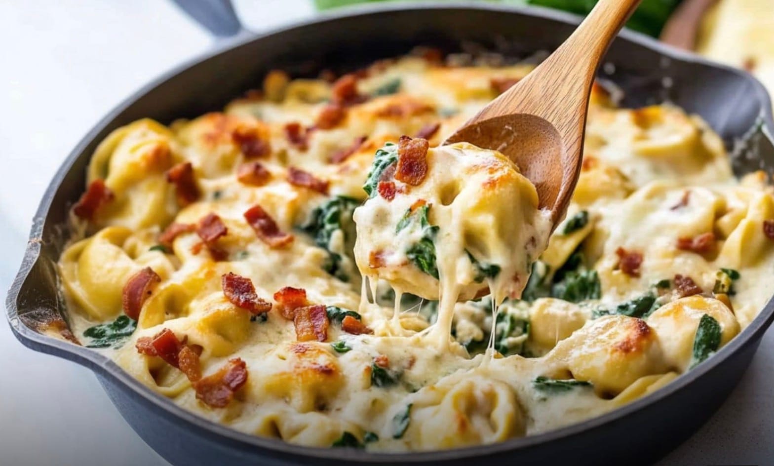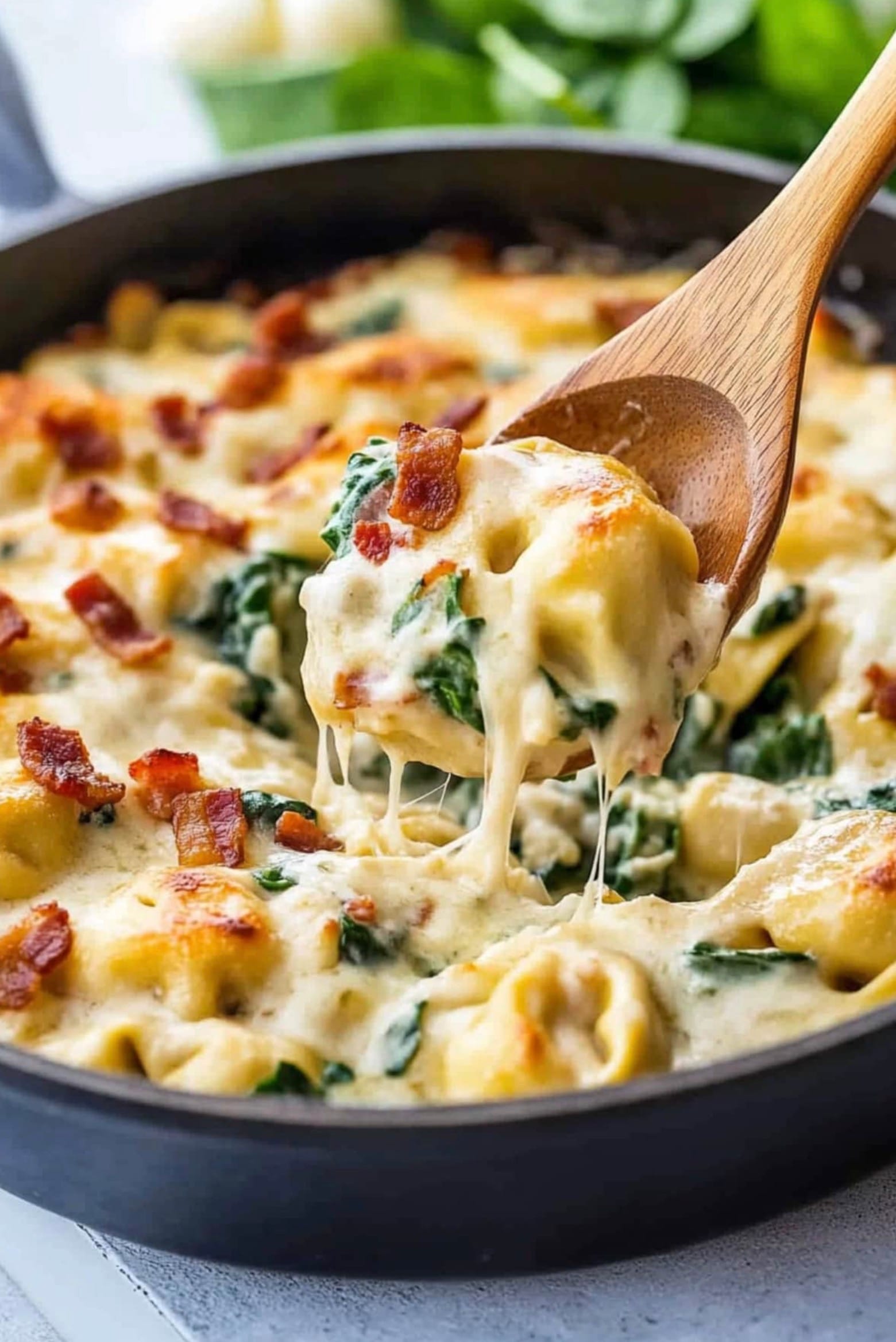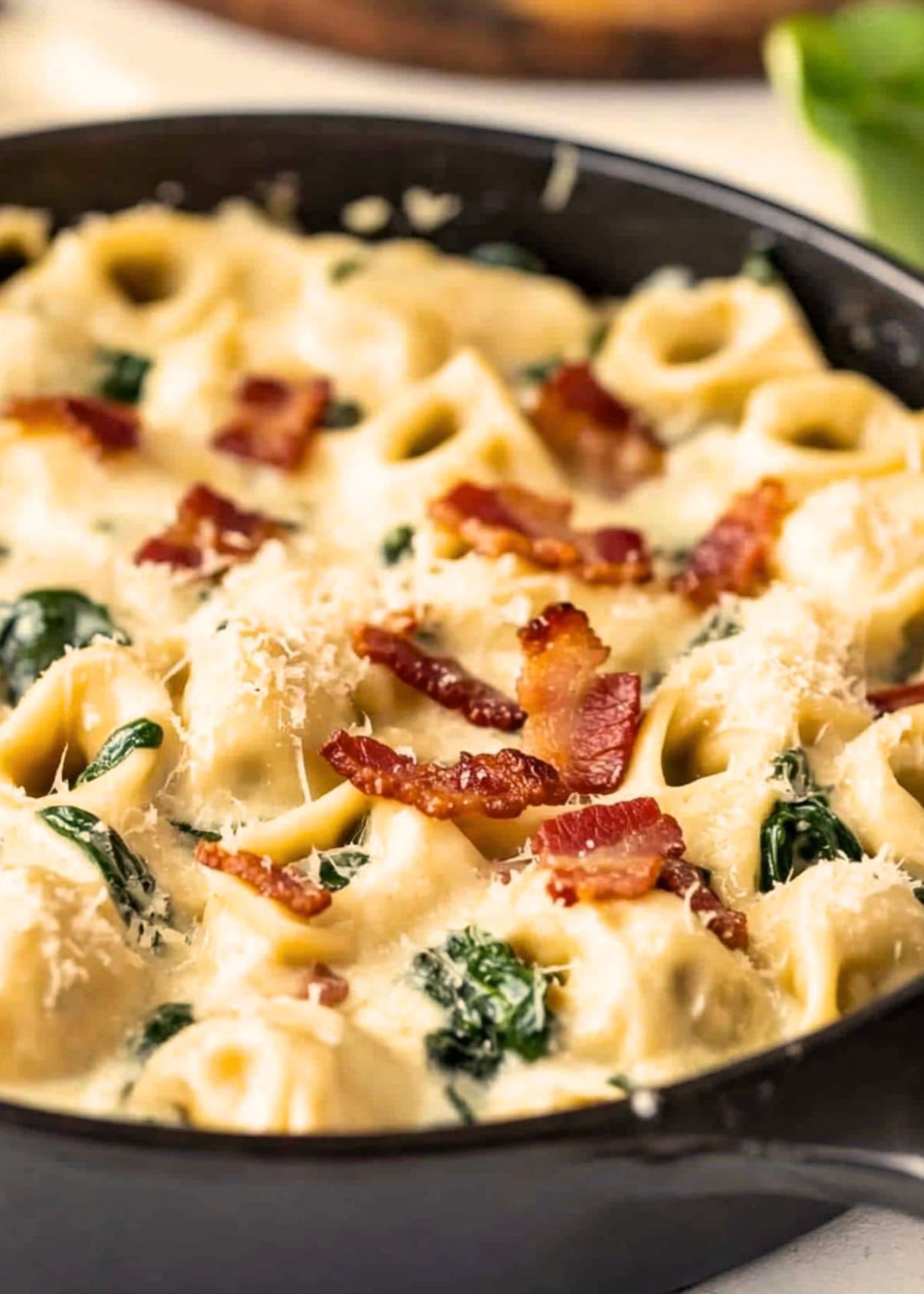You’ll need cheese tortellini, bacon, and lots of yummy cheese for this dish. The sauce is made with heavy cream, milk, and spices. You can add spinach if you want some greens. It’s baked until the cheese is melted and golden on top.