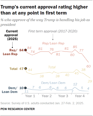 Trump’s current position looks remarkably different when compared to his first term trajectory. At this same point in 2017, his approval stood at just 40 percent with 54 percent disapproval.