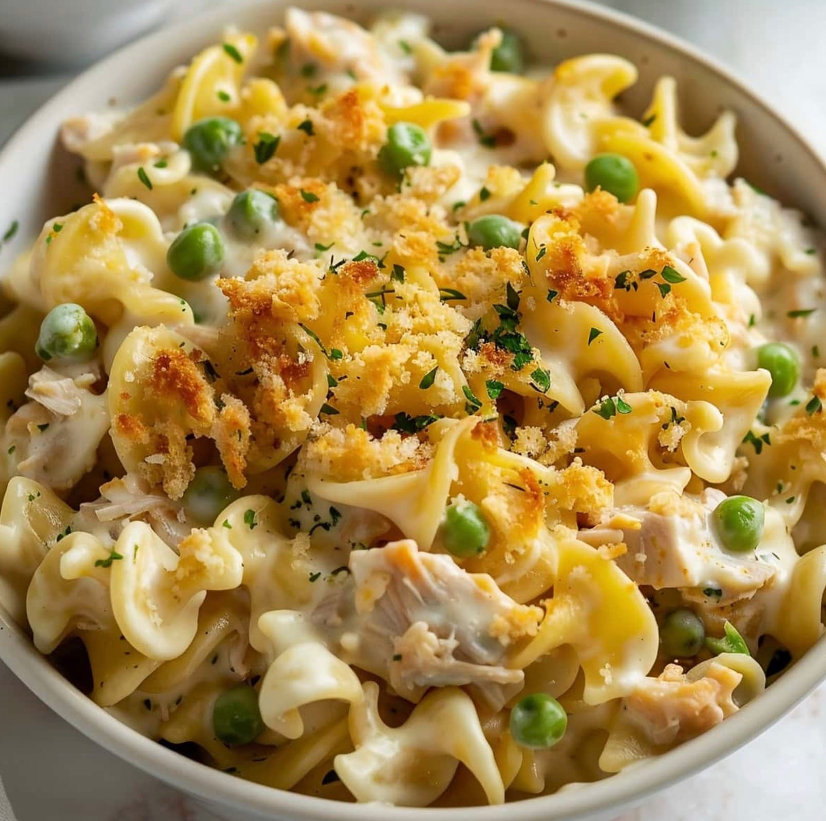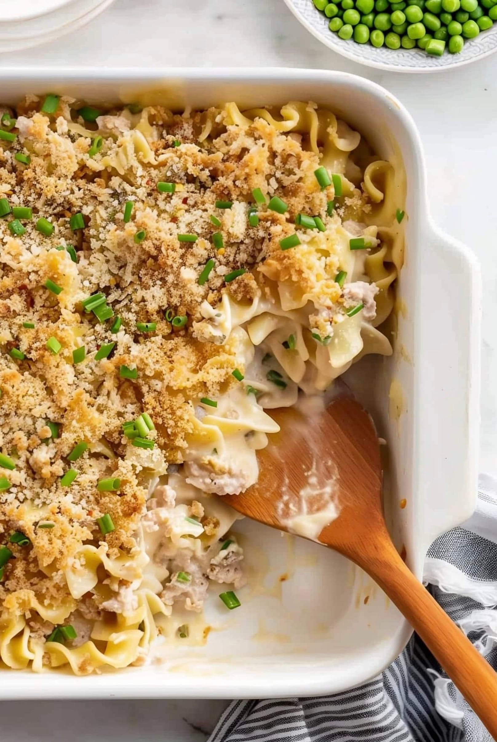 The dish combines flaky tuna, egg noodles, peas, and a rich sauce made with cheddar cheese and half-and-half. A sprinkle of lemon zest in the breadcrumb topping adds a bright, fresh flavor. With 510 calories per serving, it’s a filling meal that serves 6 people.