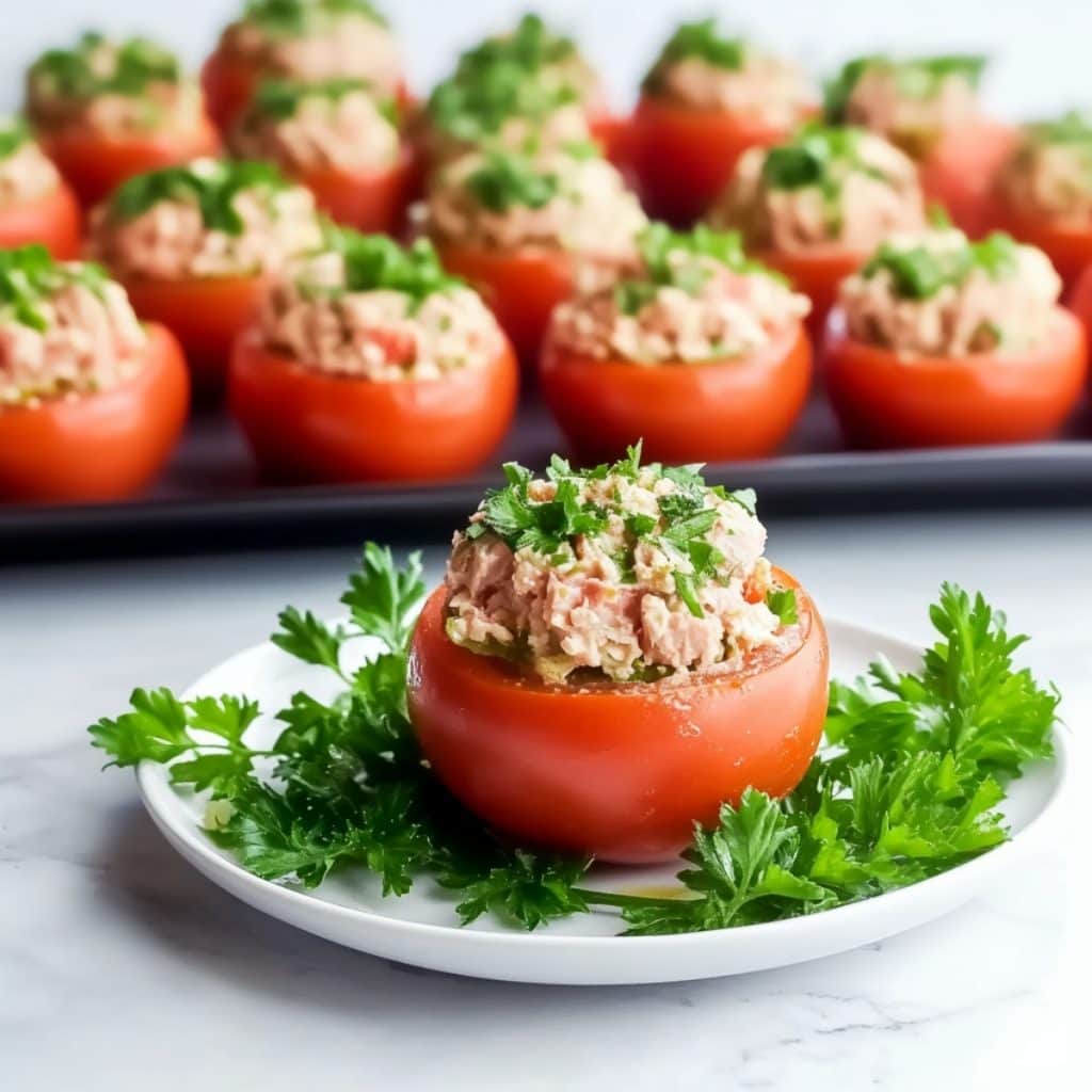 You can make these stuffed tomatoes in just 10 minutes with simple ingredients like canned tuna, mayo, yogurt, and veggies. They’re healthy, low-carb, and packed with protein. Give them a try for your next meal!
