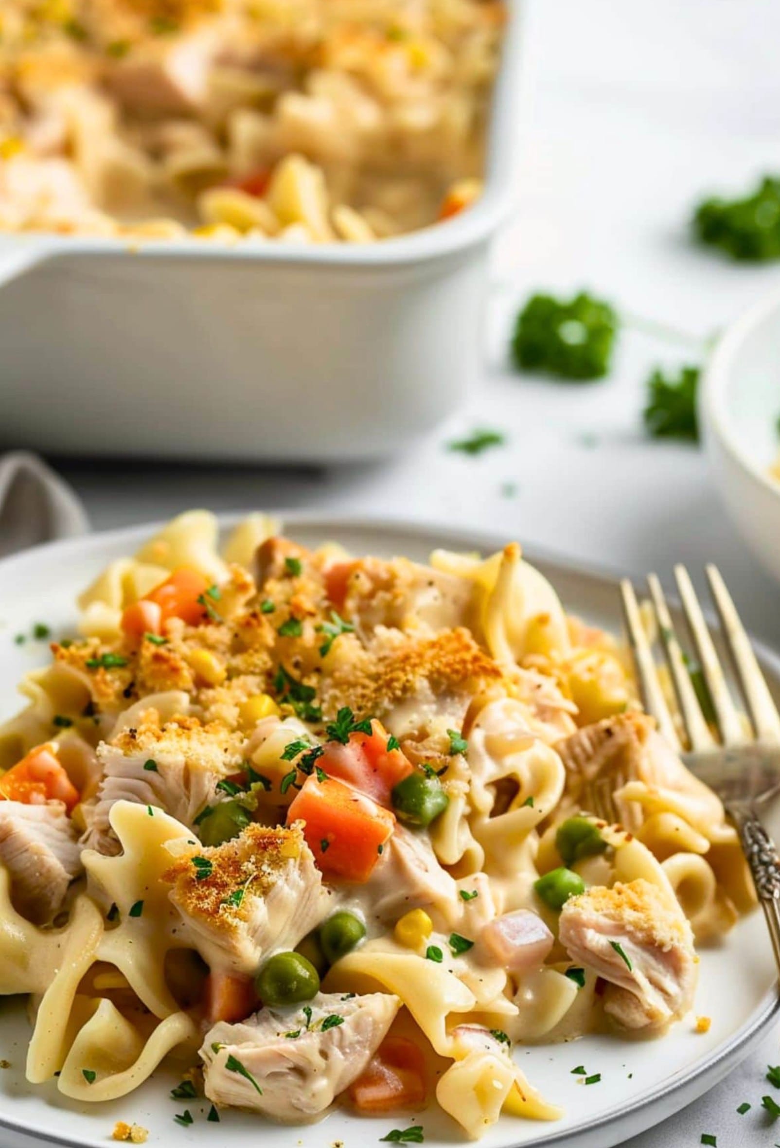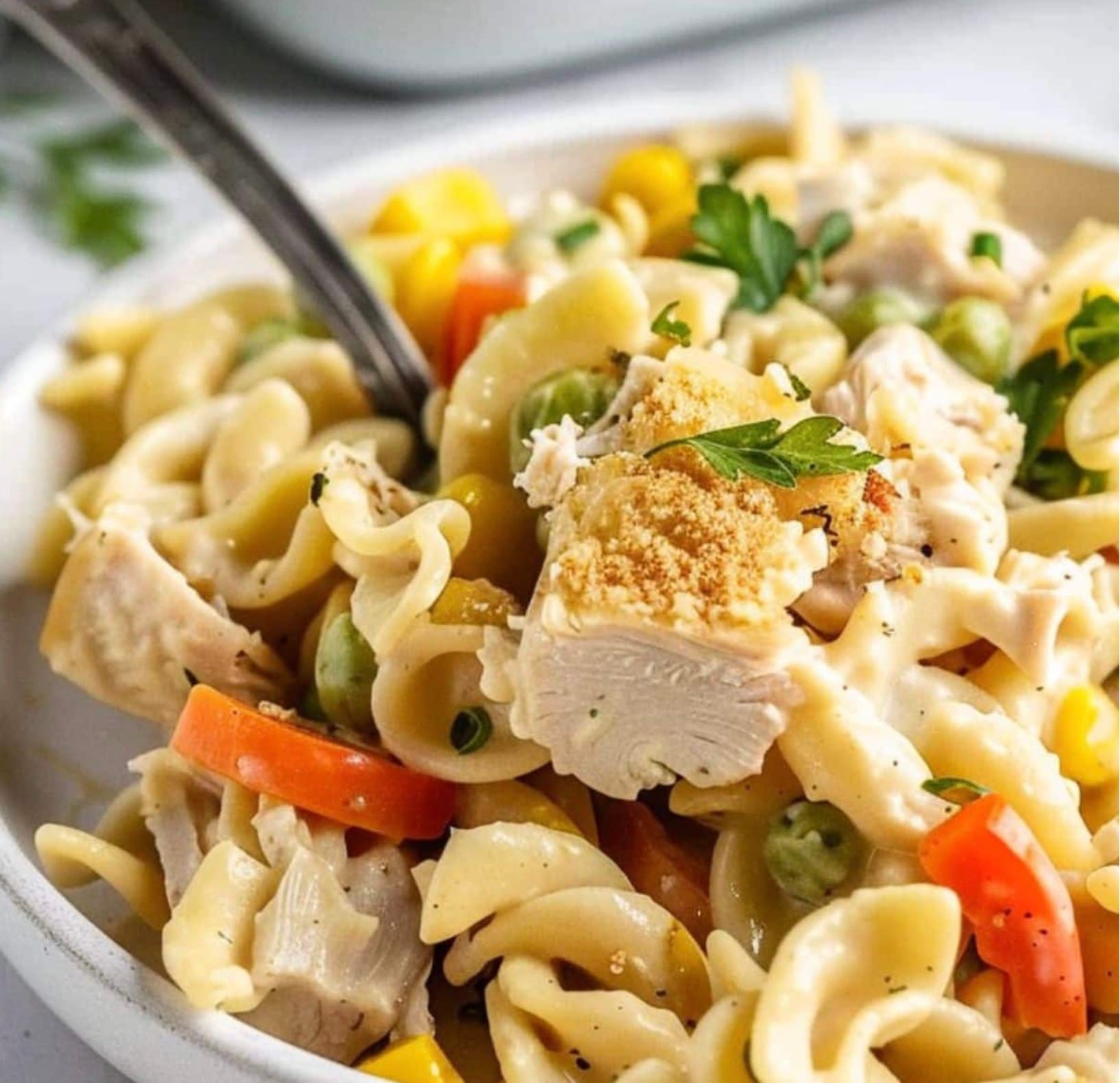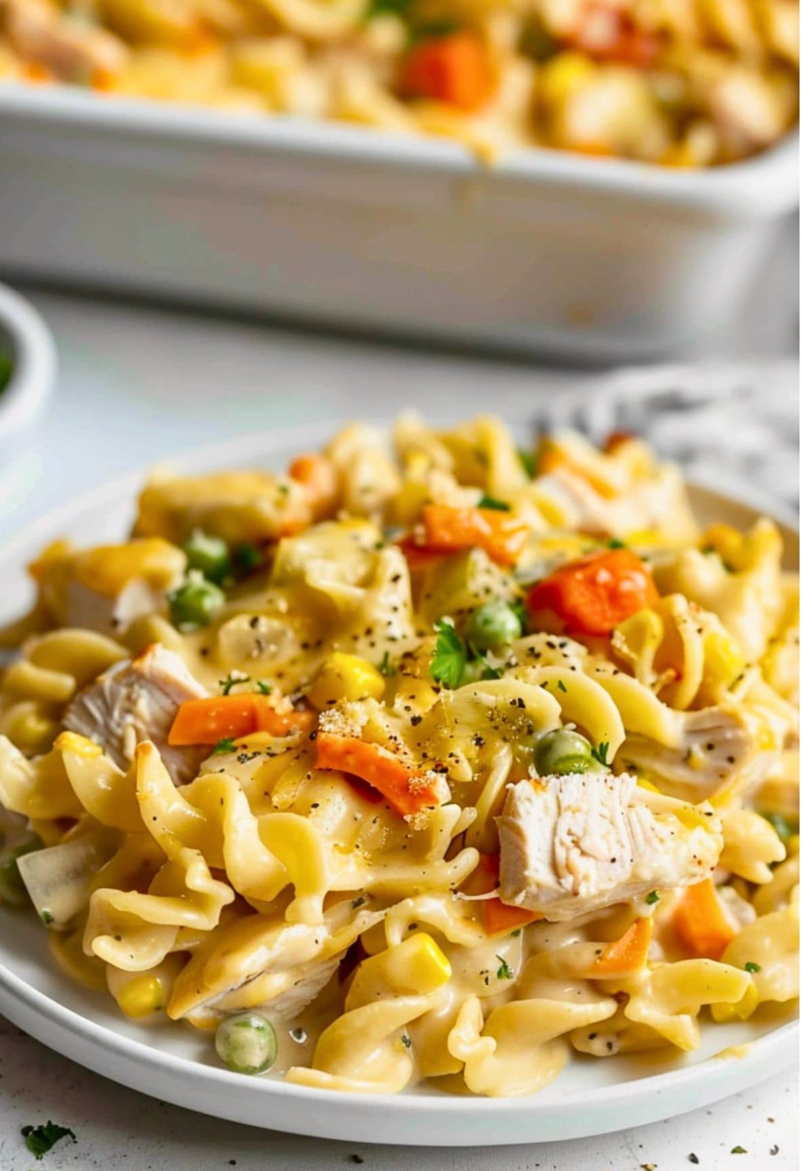 This recipe serves 12 people, so it’s perfect for big gatherings or meal prep. Each serving has 258 calories. The recipe uses simple items like egg noodles, butter, onion, and frozen veggies. You’ll also need some cooked turkey, broth, and spices to give it lots of flavor.
