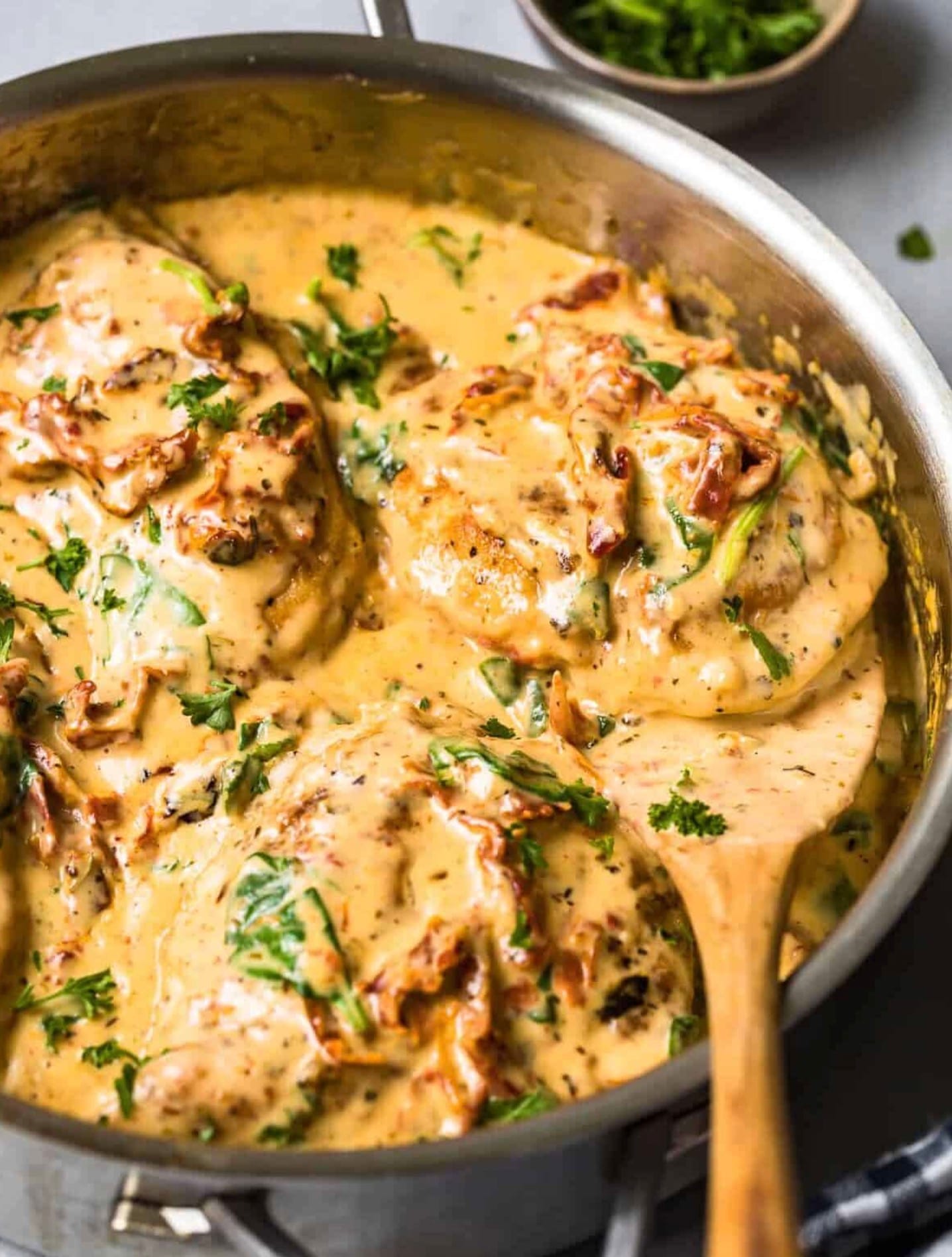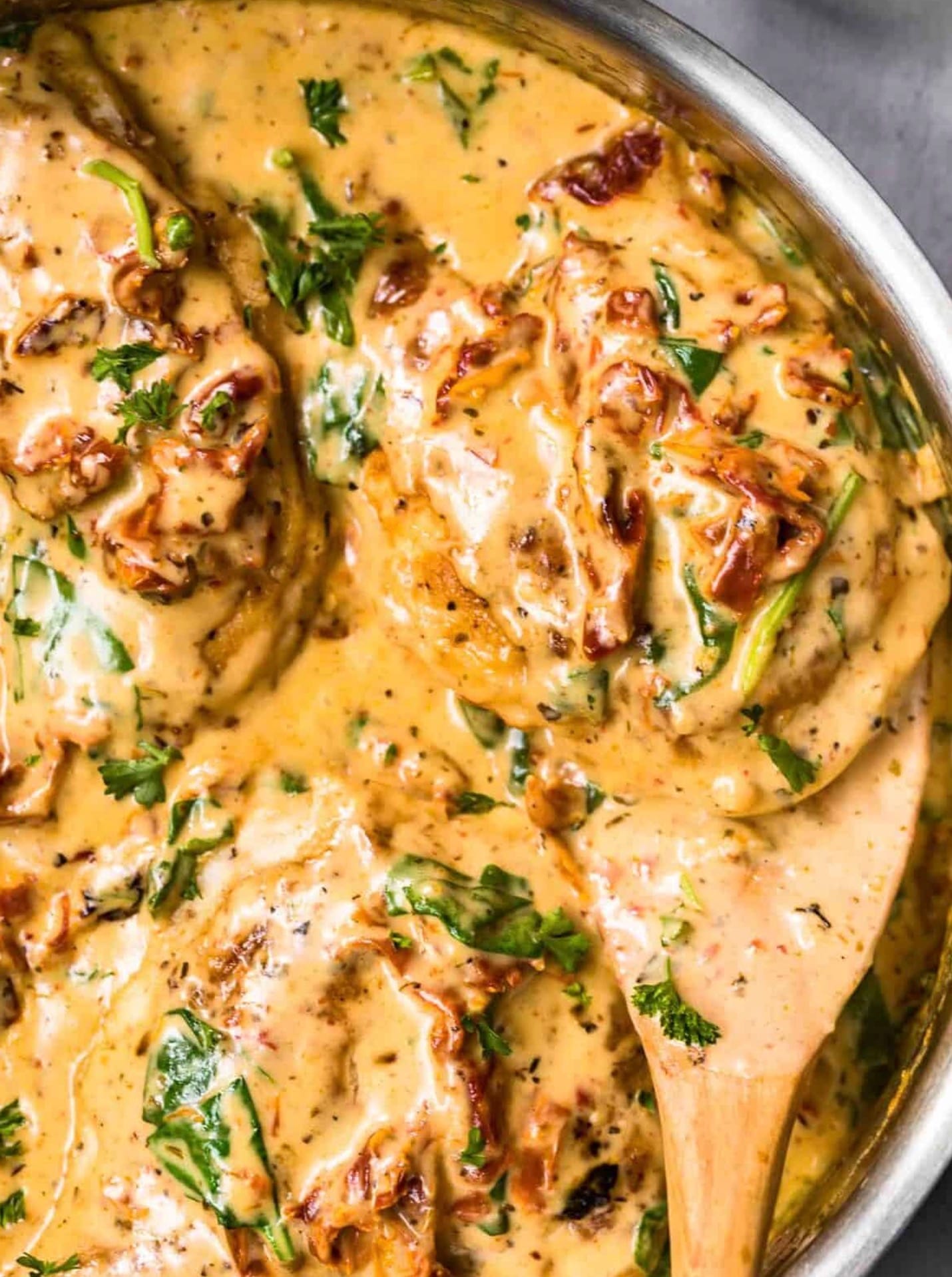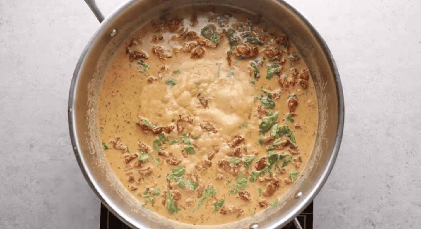 Add the Spinach: Add 1 cup of baby spinach and reduce heat to simmer. Allow to cook until the sauce slightly thickens and the spinach wilts.