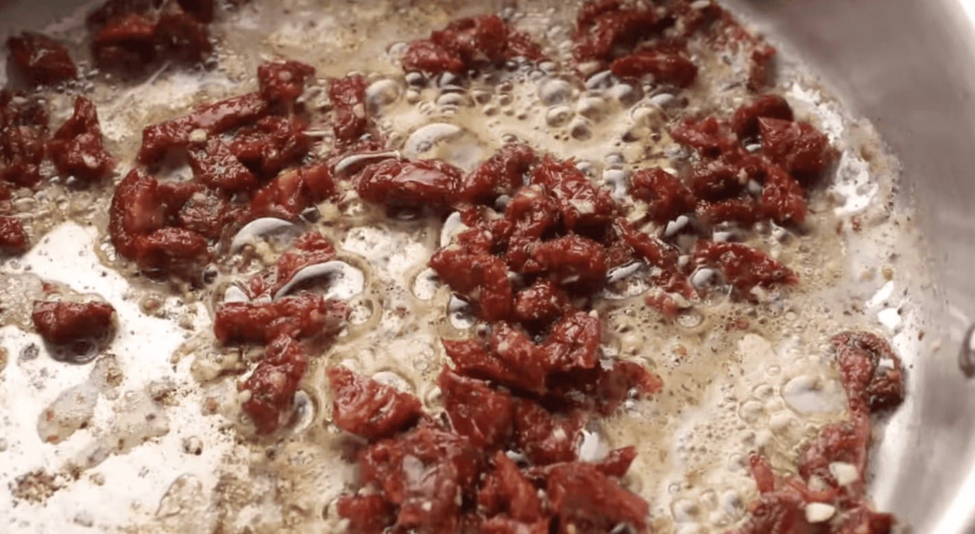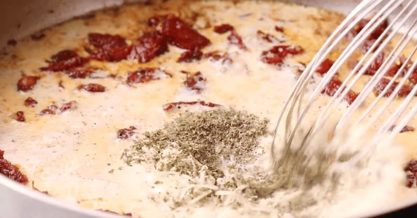 Sauté the Tomatoes: Wipe the skillet clean, and return the skillet to medium-high heat. Add the remaining ¼ of cup butter. Use a wooden spoon to scrape the bottom of the pan as the butter melts. The brown bits hold a lot of flavor, so no need to remove. Add the 4 cloves of minced garlic and 8.5 ounces of drained and rinsed sun-dried tomatoes and cook for 1-2 minutes or until fragrant. Whisk in 1 tablespoon of all-purpose flour and allow to thicken for approximately 1 minute.