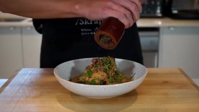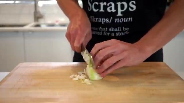 Save those scraps for stock! Next, mince six garlic cloves using a microplane or grater.