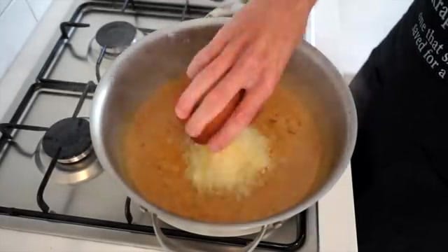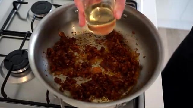 Sauté for one minute, stirring constantly. Deglaze the pan with white wine or chicken stock.