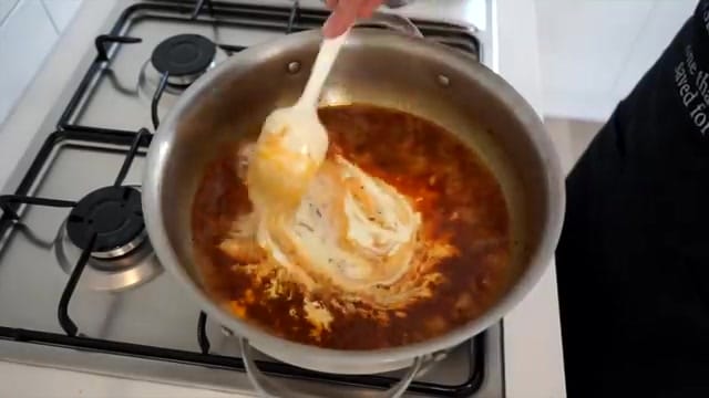 Now for the creamy magic! Pour in thickened cream and stir until you get a beautiful rosy sauce.
